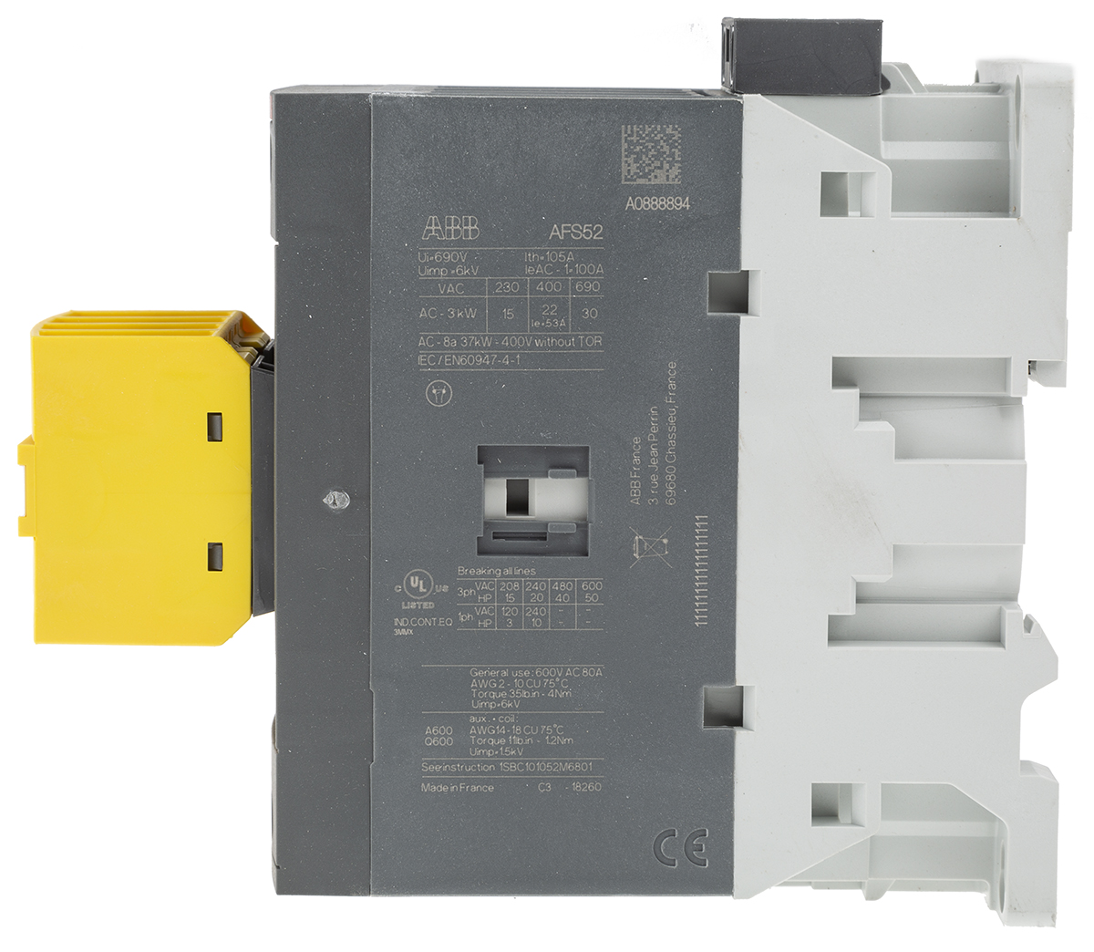 This is AFS 3 Pole Safety Contactor - 100 A 100 → 250 V dc 100 → 250 V @ 50/60 Hz Coil 3NO manufactured by ABB Jokab. The manufacturer part number is 1SBL367082R1322 AFS52-30-22-13. It performs basic function of safety. It has a maximum operating temperature of +60 °c, +70°c. The rated contact current is 100 a. The product afs, is a highly preferred choice for users. Whereas, the minimum operating temperature of the product is -40 °c, -25°c. The coil voltage of the product is 100 to 250 v ac/dc. Its accurate length is 144mm. It has 3p pole and throw configuration. Furthermore, the product is 55mm wide. The product comes in 144mm depth. It is composed of [Number of Auxiliary Contacts] auxiliary contacts. The normal state configuration includes 3no. It features afs52-30-22-13 range. In addition, it has a standard 2no + 2nc auxiliary contact configuration . The integrated contact has 600 v ac of voltage rating. It has equipped with 3 poles. The terminal is a screw type.