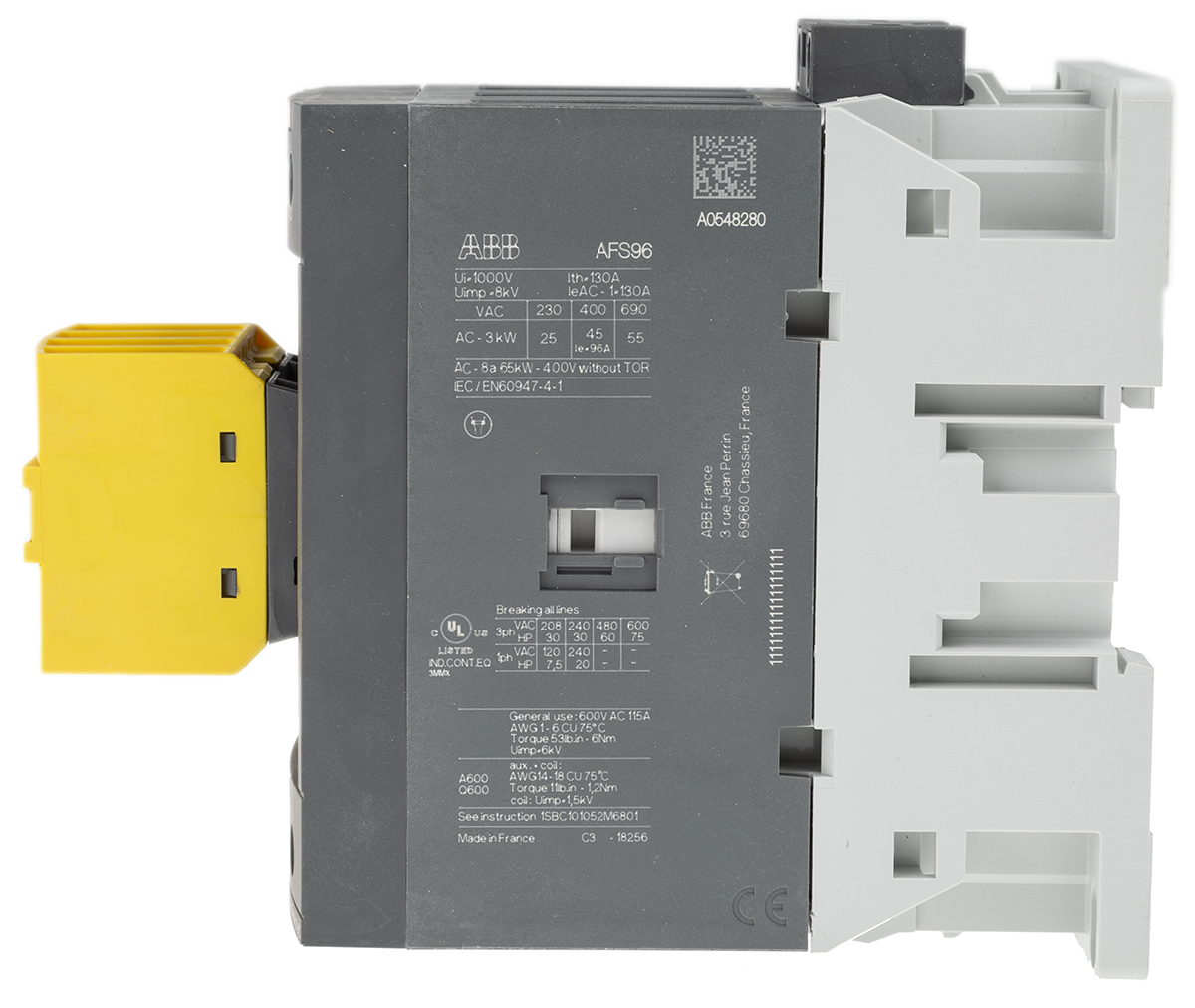 This is AFS 3 Pole Safety Contactor - 130 A 100 → 250 V dc 100 → 250 V @ 50/60 Hz Coil 3NO manufactured by ABB Jokab. The manufacturer part number is 1SBL407082R1322 AFS96-30-22-13. It performs basic function of safety. It has a maximum operating temperature of +60 °c, +70°c. The rated contact current is 130 a. The product afs, is a highly preferred choice for users. Whereas, the minimum operating temperature of the product is -40 °c, -25°c. The coil voltage of the product is 100 to 250 v ac/dc. Its accurate length is 149mm. It has 3p pole and throw configuration. Furthermore, the product is 70mm wide. The product comes in 149mm depth. It is composed of [Number of Auxiliary Contacts] auxiliary contacts. The normal state configuration includes 3no. It features afs96-30-22-13 range. In addition, it has a standard 2no + 2nc auxiliary contact configuration . The integrated contact has 600 v ac of voltage rating. It has equipped with 3 poles. The terminal is a screw type.