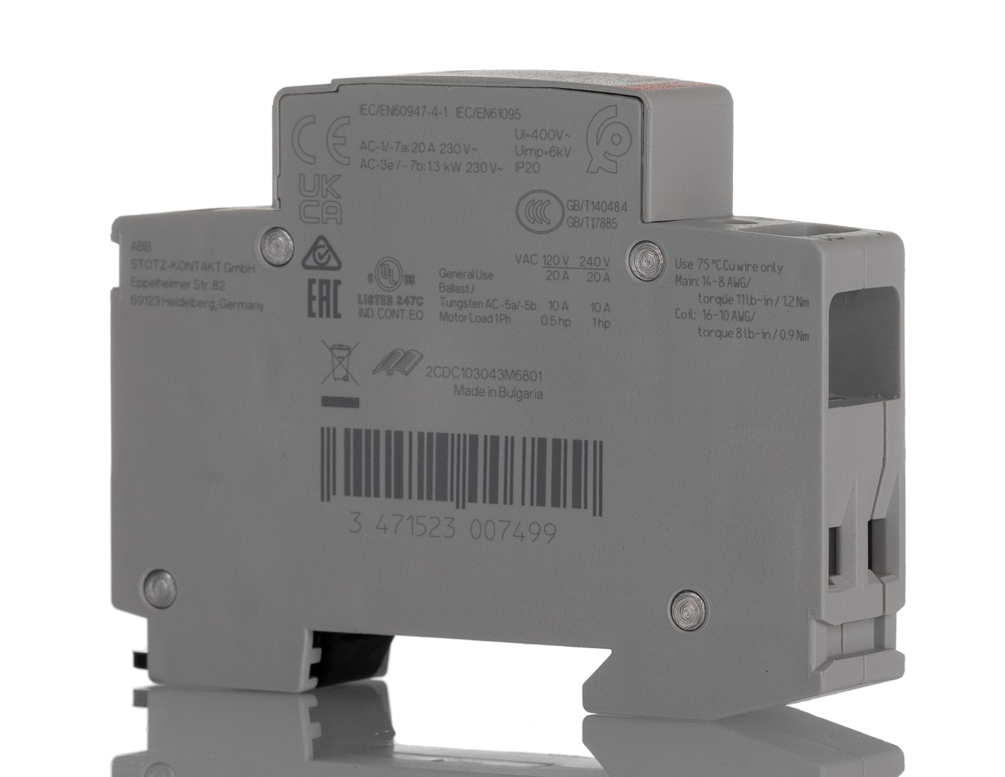 The ABB ESB20 installation contactors are used to control single loads up to 20 A and can be operated by AC or DC. These contactors are made for use in household applications as well as in industrial environments. The following benefits are provided: Hum-free operation, low power consumption and integrated overvoltage protection. Rated Operational Voltage:Main Circuit 220 V DC Main Circuit 250 V AC Rated Control Circuit Voltage (Uc):230 V Rated Frequency (f):Control Circuit DC Control Circuit 50 Hz Control Circuit 60 Hz Control Circuit 400 Hz Main Circuit DC Main Circuit 50 Hz Main Circuit 60 Hz Rated Operational Current AC-1 (Ie):(NC) 20 A