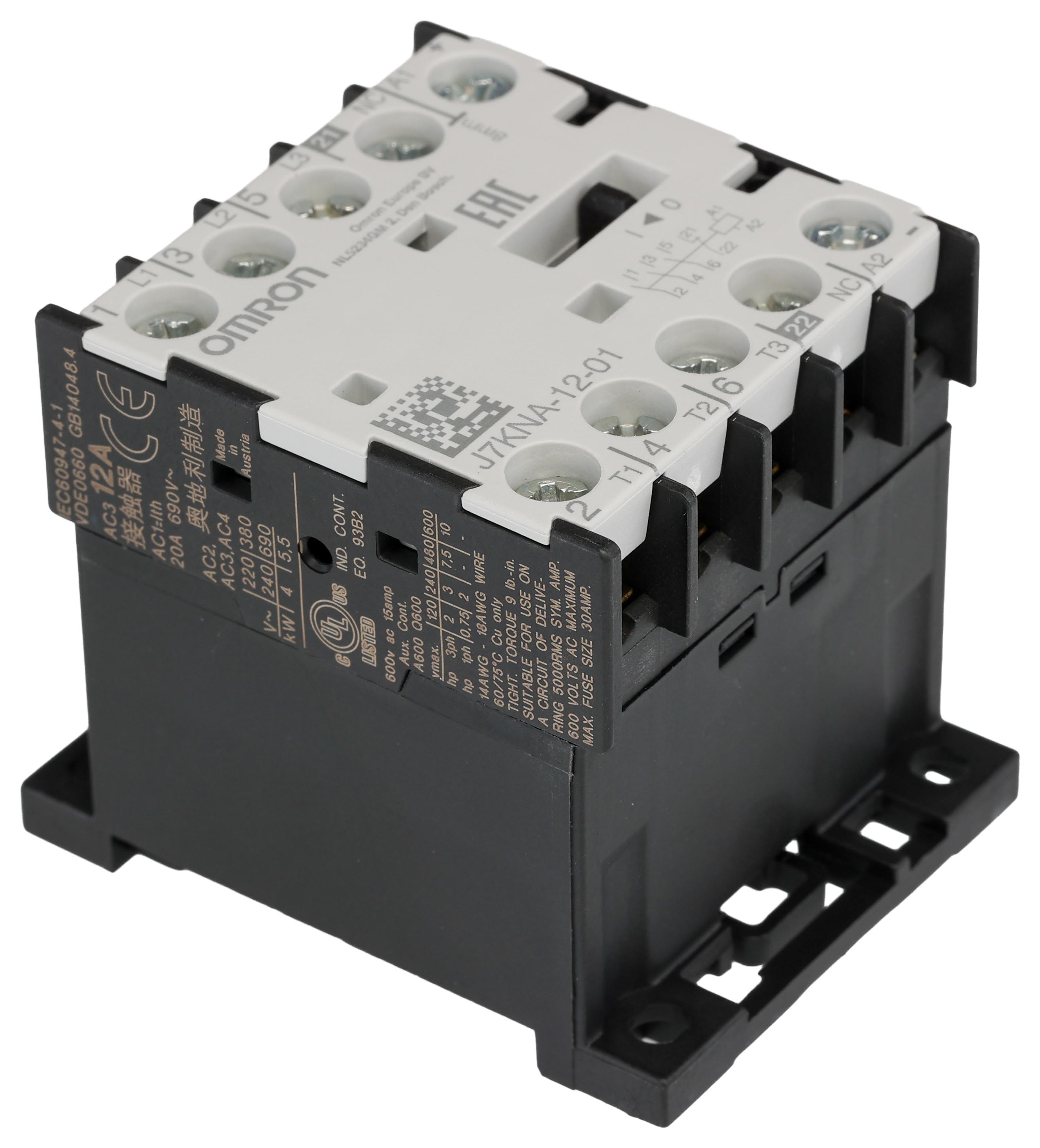 This is J7KNA Series 3 Pole Contactor - 12 A 24 V Coil 1NO 5.5 kW manufactured by Omron. The manufacturer part number is J7KNA-12-01 24. The rated contact current is 12 a. The coil voltage of the product is 24 v. It features j7kna series range. The normal state configuration includes 3no. In addition, it has a standard 1nc auxiliary contact configuration . Feature 5.5 kw of power rating. It has equipped with 3 poles.