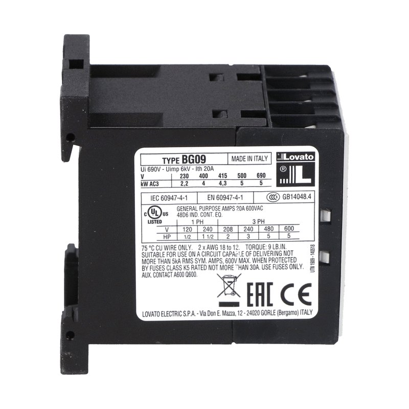 This is 3 Pole Contactor - 9 A 230 V ac Coil 1NC 5 kW manufactured by Lovato. The manufacturer part number is 11BG0901A230. Whereas, the minimum operating temperature of the product is -50°c. It has a typical 7.6a load current. The rated contact current is 9 a. It has a maximum operating temperature of +70°c. The coil voltage of the product is 230 v ac. Its accurate length is 57mm. It has 3p pole and throw configuration. Furthermore, the product is 44mm wide. The product comes in 58mm depth. It is composed of [Number of Auxiliary Contacts] auxiliary contacts. The normal state configuration includes 1nc. In addition, it has a standard 1nc auxiliary contact configuration . Feature 5 kw of power rating. It has equipped with 3 poles. It has about 20a input current .