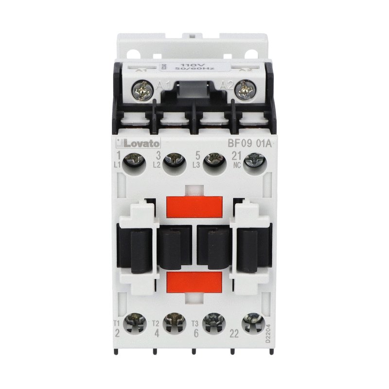 This is 3 Pole Contactor - 9 A 400 V ac Coil 1NC 7.5 kW manufactured by Lovato. The manufacturer part number is BF0901A400. The rated contact current is 9 a. Feature 7.5 kw of power rating. The coil voltage of the product is 400 v ac. It has equipped with 3 poles. The normal state configuration includes 1nc.