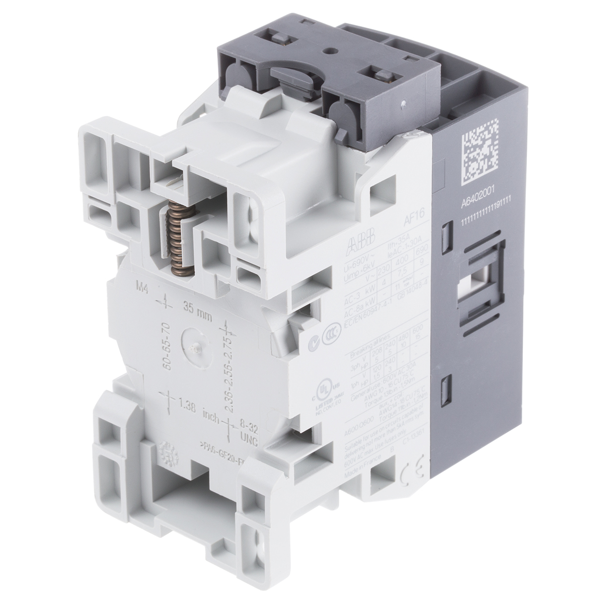 This is AF Range AF16 3 Pole Contactor - 10.5 A 500 V dc Coil 3NO 7.5 kW manufactured by ABB. The manufacturer part number is 1SBL177001R1401 AF16-30-01-14. It has a maximum operating temperature of +70°c. The rated contact current is 10.5 a. The product af, is a highly preferred choice for users. Whereas, the minimum operating temperature of the product is -40°c. The coil voltage of the product is 250 → 500 v ac/dc. Its accurate length is 80mm. Furthermore, the product is 45mm wide. The product comes in 77mm depth. It is composed of [Number of Auxiliary Contacts] auxiliary contacts. The normal state configuration includes 3no. It features af16 range. Feature 7.5 kw of power rating. The integrated contact has 690 v ac of voltage rating. It has equipped with 3 poles. The terminal is a screw type.