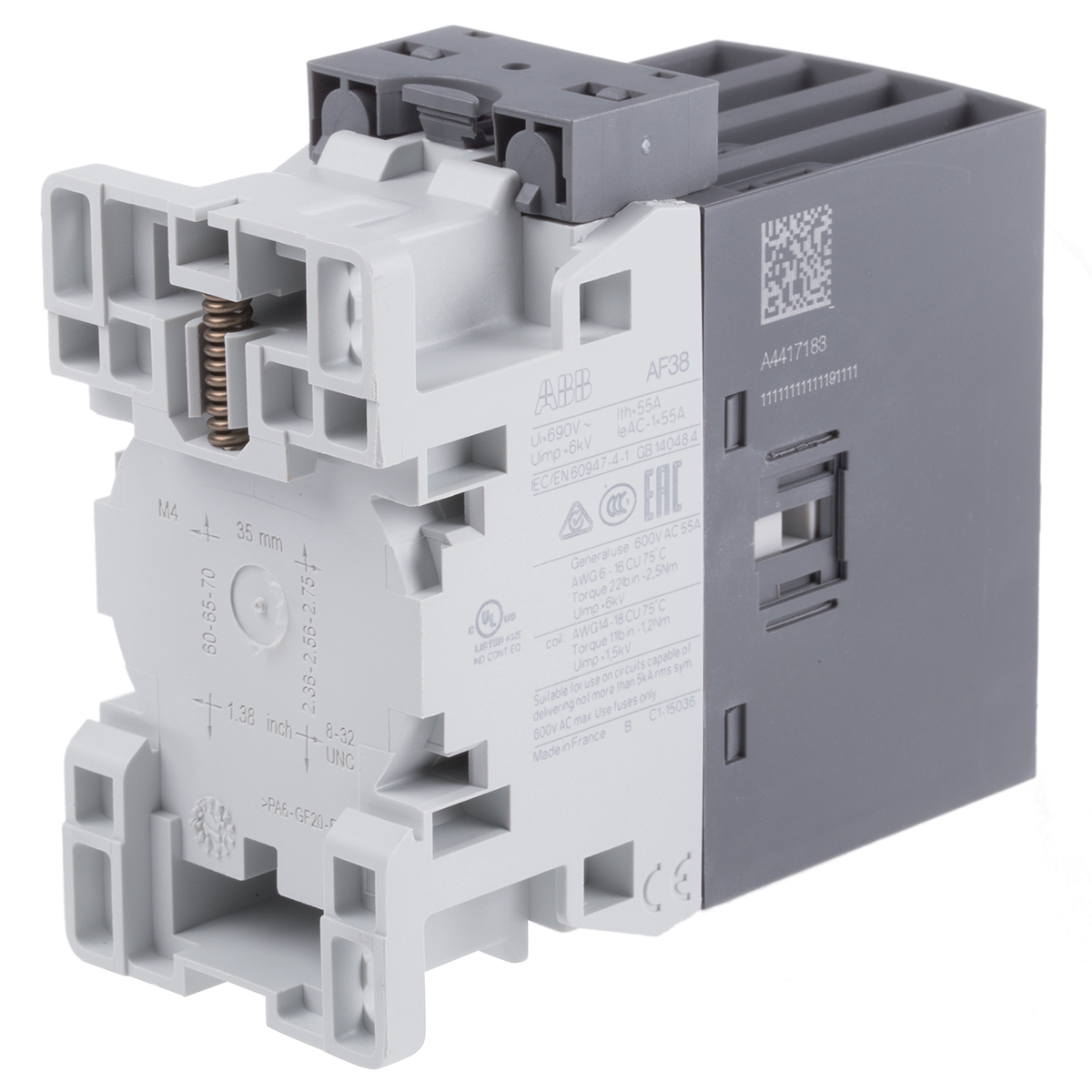 This is AF Range AF38 4 Pole Contactor - 55 A 230 V ac/dc Coil 4NO 18.5 kW manufactured by ABB. The manufacturer part number is 1SBL297201R1400 AF38-40-00-14. It has a maximum operating temperature of +70°c. The rated contact current is 55 a. The product af, is a highly preferred choice for users. Whereas, the minimum operating temperature of the product is -40°c. The coil voltage of the product is 250 → 500 v ac/dc. Its accurate length is 86mm. Furthermore, the product is 45mm wide. The product comes in 101mm depth. It is composed of [Number of Auxiliary Contacts] auxiliary contacts. The normal state configuration includes 4no. It features af38-40-00-14 range. Feature 18.5 kw of power rating. The integrated contact has 690 v ac of voltage rating. It has equipped with 4 poles. The terminal is a screw type.