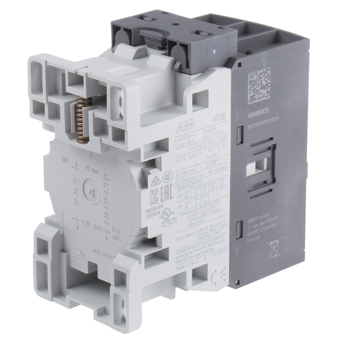 This is AF Range AF38 3 Pole Contactor - 50 A 24 V ac/dc Coil 3NO 18.5 kW manufactured by ABB. The manufacturer part number is 1SBL297001R1100 AF38-30-00-11. It has a maximum operating temperature of +60°c. The rated contact current is 50 a. The product af, is a highly preferred choice for users. It has 60 v control voltage . The coil voltage of the product is 24 v ac/dc. Its accurate length is 86mm. The product is available in din rail style. Furthermore, the product is 45mm wide. The product comes in 86mm depth. It is composed of [Number of Auxiliary Contacts] auxiliary contacts. The normal state configuration includes 3no. Whereas, the minimum operating temperature of the product is -25°c. It features af38-30-00-11 range. Feature 18.5 kw of power rating. The integrated contact has 690 v ac of voltage rating. It has equipped with 3 poles. The terminal is a screw type.