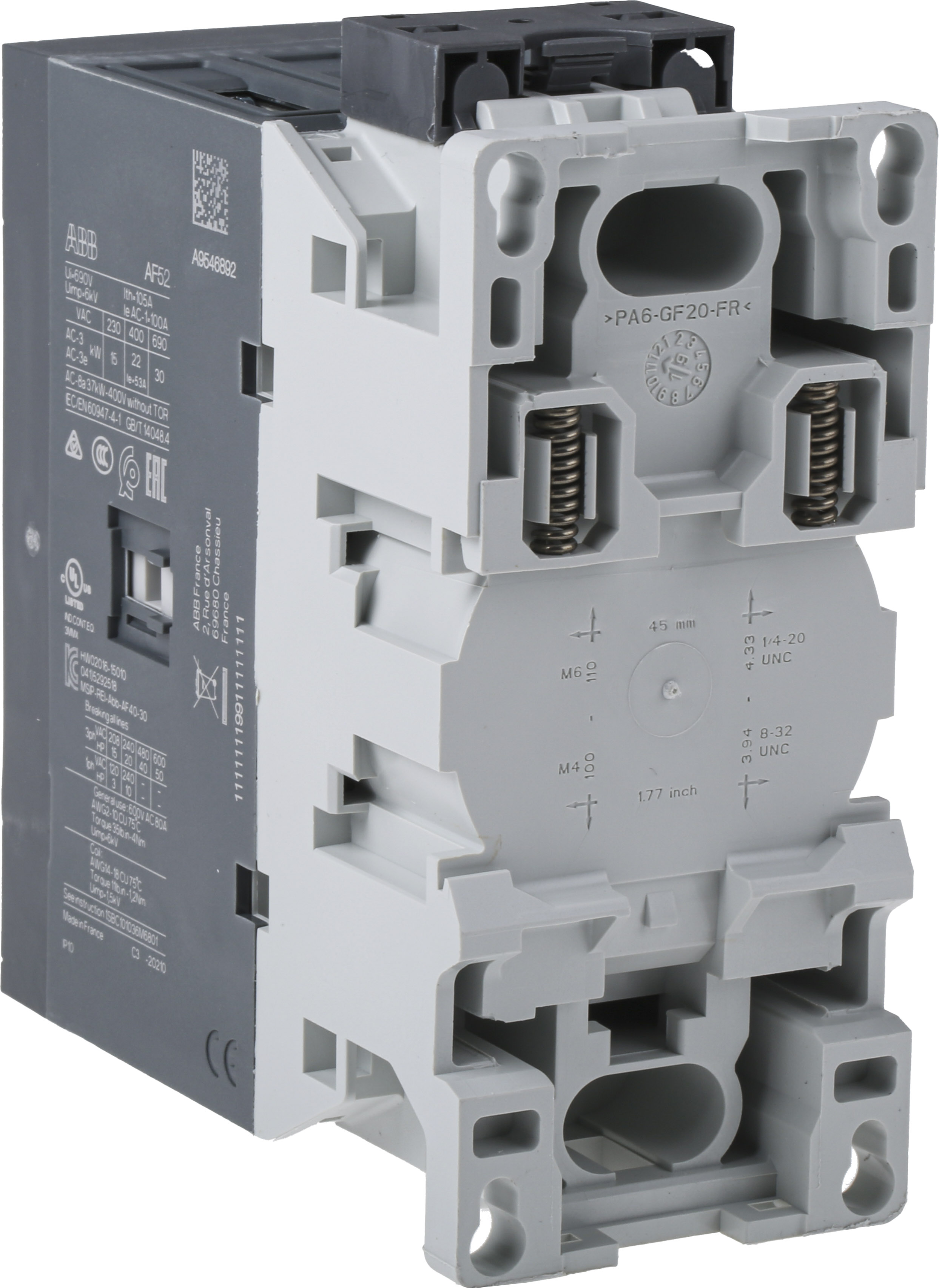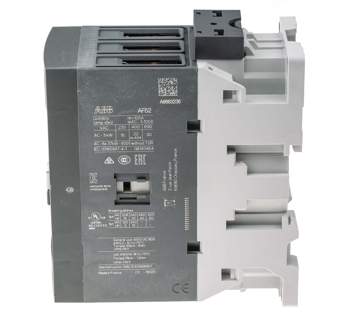 This is AF Range AF52 3 Pole Contactor - 100 A 230 V ac Coil 3NO 22 kW manufactured by ABB. The manufacturer part number is 1SBL367001R1300 AF52-30-00-13. It has a maximum operating temperature of +70°c. The rated contact current is 100 a. The product af, is a highly preferred choice for users. Whereas, the minimum operating temperature of the product is -40°c. The coil voltage of the product is 230 v ac. Its accurate length is 55mm. It has 3p pole and throw configuration. The product is available in din rail mount style. Furthermore, the product is 125.5mm wide. The product comes in 111mm depth. It is composed of [Number of Auxiliary Contacts] auxiliary contacts. The normal state configuration includes 3no. It features af52 range. Feature 22 kw of power rating. The integrated contact has 690 v ac of voltage rating. It has equipped with 3 poles. The terminal is a screw type.