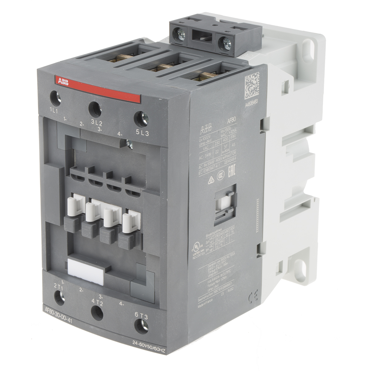 This is AF Range AF80 3 Pole Contactor - 125 A 24 V ac/dc Coil 3NO 37 kW manufactured by ABB. The manufacturer part number is 1SBL397001R4100 AF80-30-00-41. It has a maximum operating temperature of +70°c. The rated contact current is 125 a. The product af, is a highly preferred choice for users. Whereas, the minimum operating temperature of the product is -40°c. The coil voltage of the product is 24 → 60 v ac. Its accurate length is 70mm. It has 3p pole and throw configuration. Furthermore, the product is 125.5mm wide. The product comes in 116mm depth. It is composed of [Number of Auxiliary Contacts] auxiliary contacts. The normal state configuration includes 3no. It features af80 range. Feature 37 kw of power rating. The integrated contact has 690 v ac of voltage rating. It has equipped with 3 poles. The terminal is a screw type.