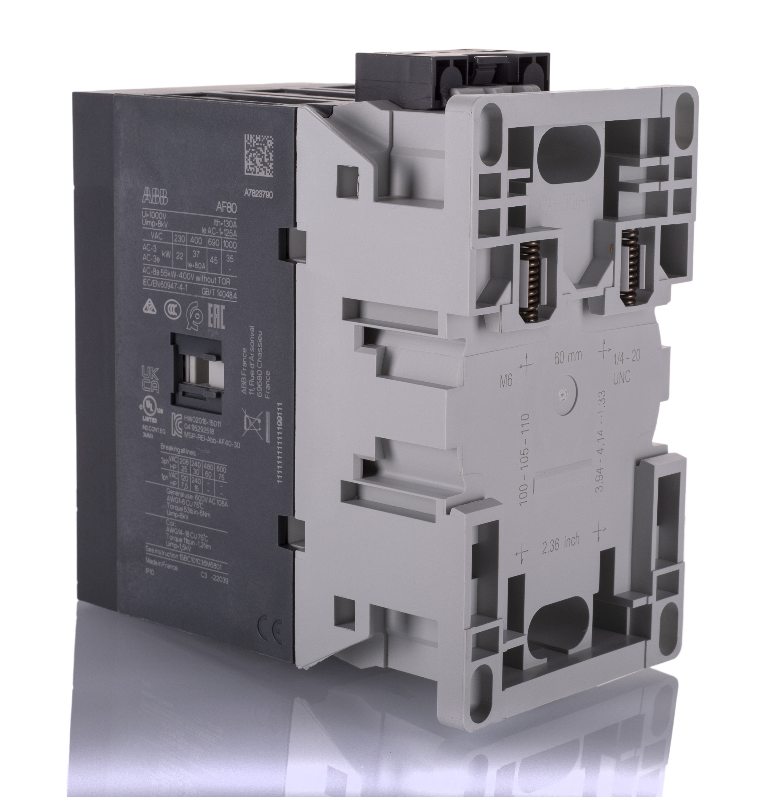 This is AF Range AF80 3 Pole Contactor - 125 A 24 V ac/dc Coil 3NO 37 kW manufactured by ABB. The manufacturer part number is 1SBL397001R1100 AF80-30-00-11. It has a maximum operating temperature of +70°c. The rated contact current is 125 a. The product af, is a highly preferred choice for users. Whereas, the minimum operating temperature of the product is -40°c. The coil voltage of the product is 20 → 60 v dc. Its accurate length is 70mm. It has 3p pole and throw configuration. Furthermore, the product is 125.5mm wide. The product comes in 116mm depth. It is composed of [Number of Auxiliary Contacts] auxiliary contacts. The normal state configuration includes 3no. It features af80 range. Feature 37 kw of power rating. The integrated contact has 690 v ac of voltage rating. It has equipped with 3 poles. The terminal is a screw type.