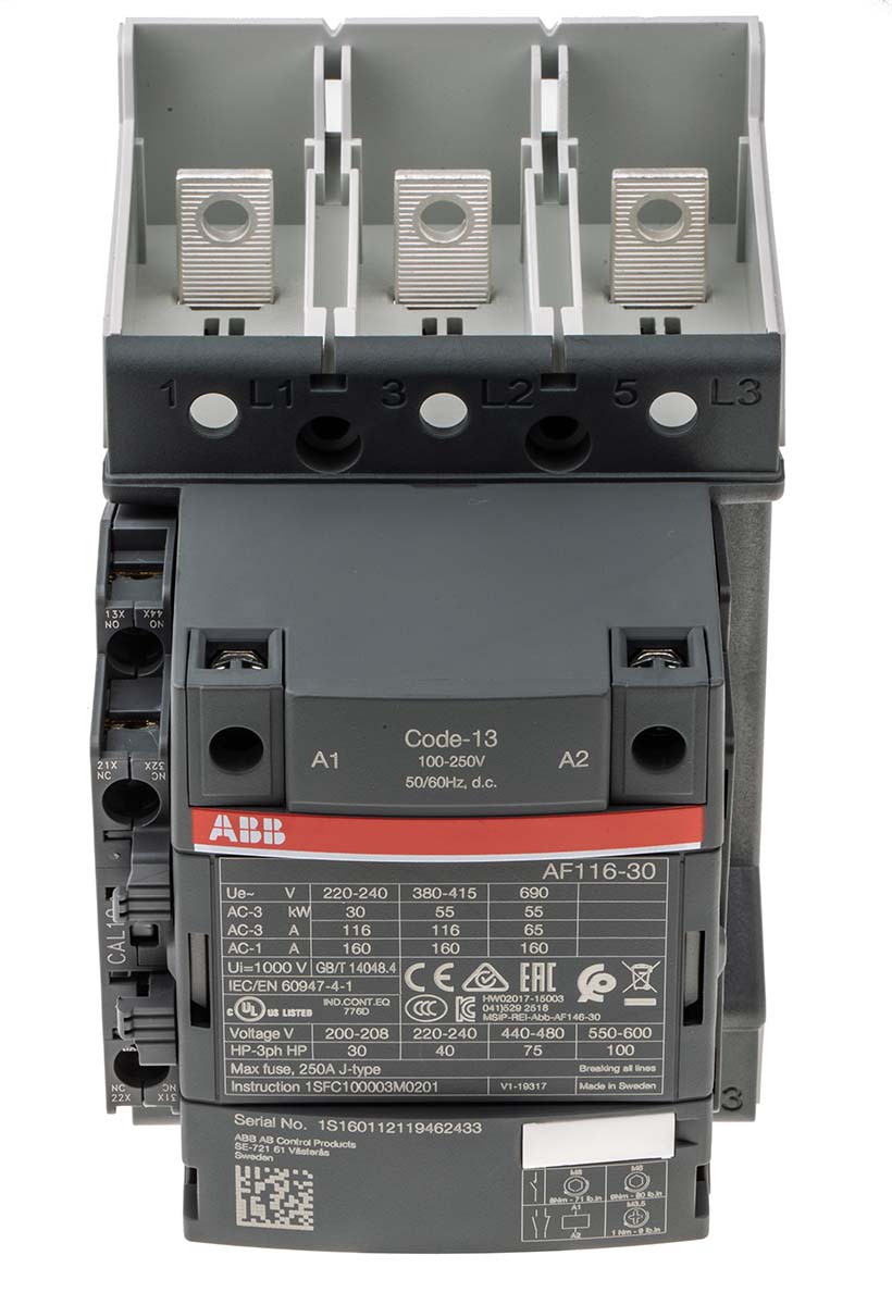 This is AF Range AF116 3 Pole Contactor - 160 A 230 V ac Coil 3NO 55 kW manufactured by ABB. The manufacturer part number is 1SFL427002R1311 AF116-30-11B-13. It has a maximum operating temperature of +70°c. The rated contact current is 160 a. The product af, is a highly preferred choice for users. Whereas, the minimum operating temperature of the product is -40°c. The coil voltage of the product is 230 v ac. Its accurate length is 90mm. It has 3p pole and throw configuration. Furthermore, the product is 150mm wide. The product comes in 126mm depth. It is composed of [Number of Auxiliary Contacts] auxiliary contacts. The normal state configuration includes 3no. It features af116 range. Feature 55 kw of power rating. The integrated contact has 690 v ac of voltage rating. It has equipped with 3 poles. The terminal is a lug ring terminal type.