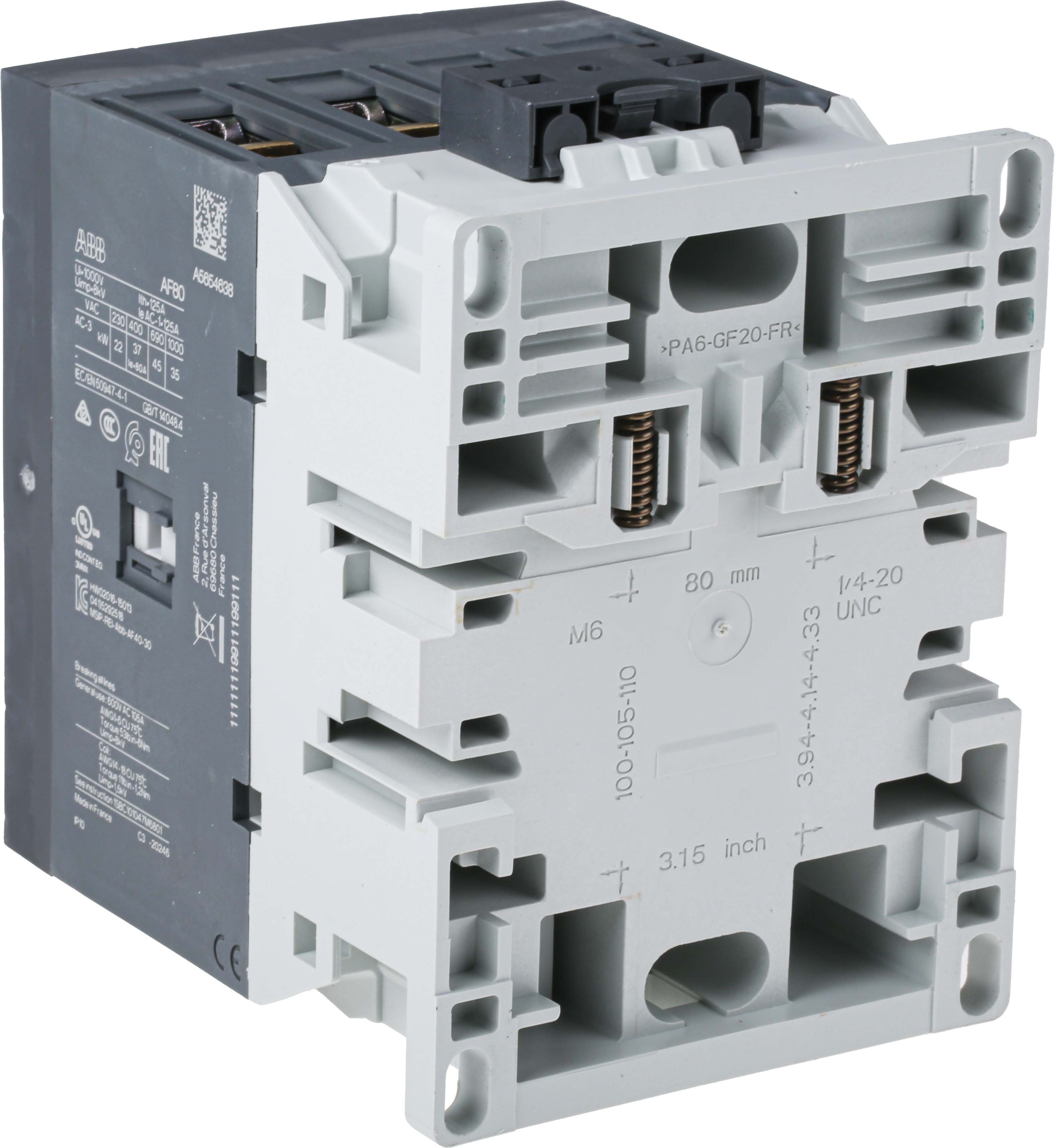 This is AF Range AF40 4 Pole Contactor - 125 A 230 V ac Coil 4NO 37 kW manufactured by ABB. The manufacturer part number is 1SBL397201R1300 AF80-40-00-13. It has a maximum operating temperature of +70°c. The rated contact current is 125 a. The product af, is a highly preferred choice for users. Whereas, the minimum operating temperature of the product is -40°c. The coil voltage of the product is 230 v ac. Its accurate length is 150mm. Furthermore, the product is 150mm wide. The product comes in 103mm depth. It is composed of [Number of Auxiliary Contacts] auxiliary contacts. The normal state configuration includes 4no. It features af40 range. Feature 37 kw of power rating. The integrated contact has 690 v ac of voltage rating. It has equipped with 4 poles. The terminal is a screw type.
