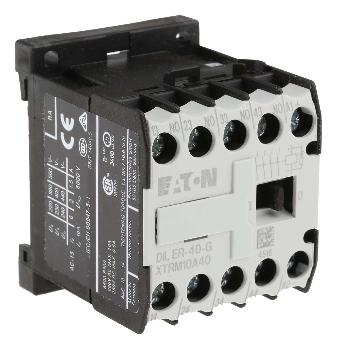 This is Contactor Relay - 4NO 3 A Contact Rating xStart manufactured by Eaton. The manufacturer part number is 010223 DILER-40-G(24VDC). The normal state configuration includes 4no. The rated contact current is 3 a. It has a maximum operating temperature of +40°c. Whereas, the minimum operating temperature of the product is -25°c. The coil voltage of the product is 24 v dc. Its accurate length is 58mm. It has 4p pole and throw configuration. The product is available in din rail mount style. Furthermore, the product is 45mm wide. The product comes in 54mm depth. It is composed of [Number of Auxiliary Contacts] auxiliary contacts. It features xstart range. In addition, it has a standard 4no auxiliary contact configuration . The integrated contact has 400 v ac of voltage rating. It has equipped with 4 poles. The terminal is a screw type.