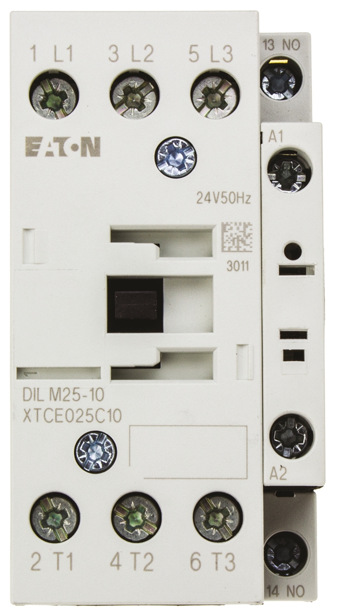 This is xStart DILM 3 Pole Contactor - 25 A 24 V ac Coil 3NO 11 kW manufactured by Eaton. The manufacturer part number is 277119 DILM25-10(24V50HZ). The normal state configuration includes 3no. The rated contact current is 25 a. It has a maximum operating temperature of +40°c. It has 24 v control voltage . The coil voltage of the product is 24 v ac. Its accurate length is 85mm. It has 3p pole and throw configuration. The product is available in din rail mount style. Furthermore, the product is 56mm wide. The product comes in 138mm depth. It is composed of [Number of Auxiliary Contacts] auxiliary contacts. Whereas, the minimum operating temperature of the product is -25°c. It features xstart range. In addition, it has a standard 1no auxiliary contact configuration . Feature 11 kw of power rating. The integrated contact has 400 v ac of voltage rating. It has equipped with 3 poles. The terminal is a screw type.
