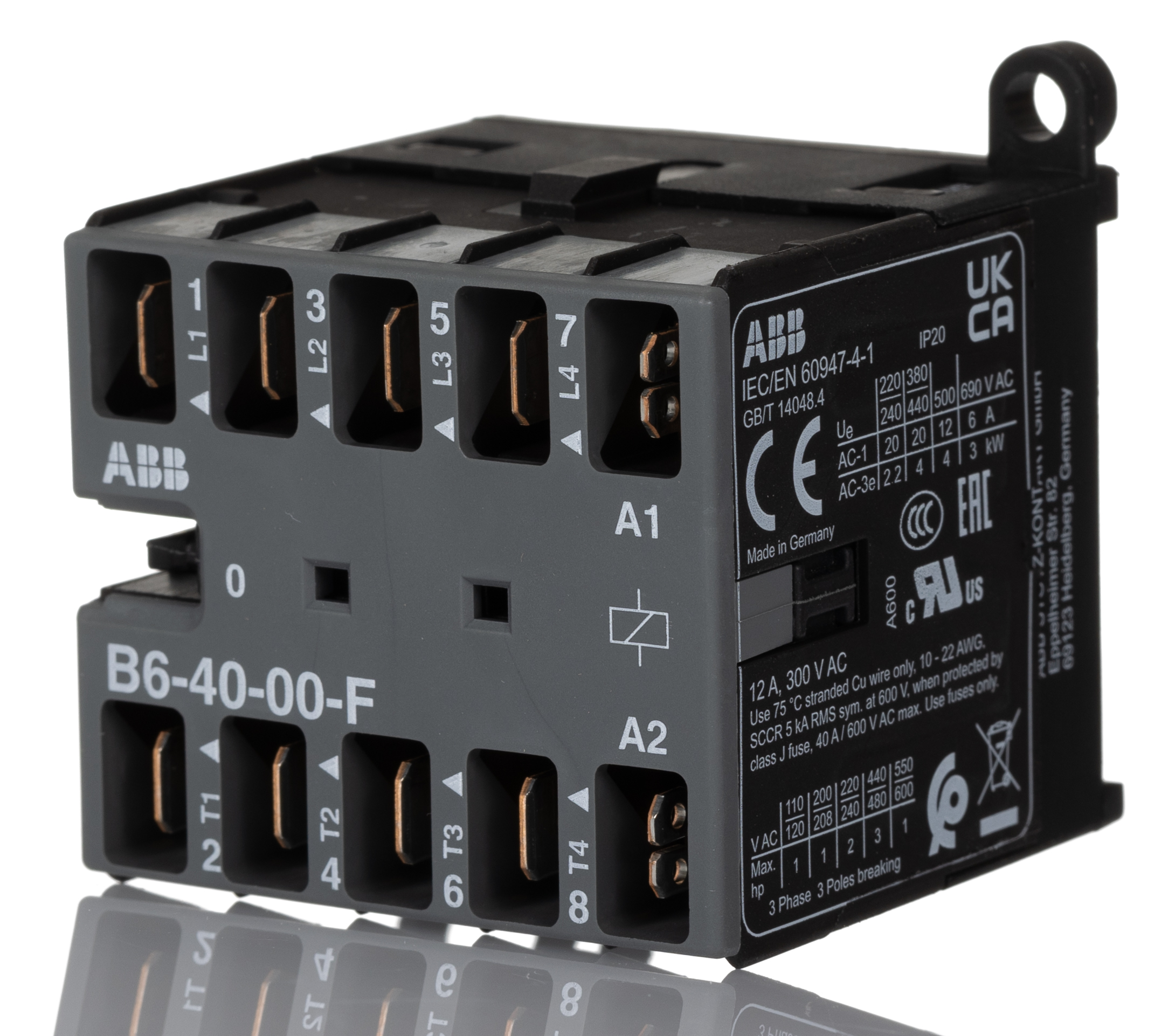 This is B6 4 Pole Contactor - 20 A 220 → 240 V Coil 4 kW manufactured by ABB. The manufacturer part number is GJL1211203R8000 B6-40-00-F 220-240V AC. The rated contact current is 20 a. The product b6, is a highly preferred choice for users. It has 220 → 240 v ac control voltage . The coil voltage of the product is 220 → 240 v. Its accurate length is 46.7mm. The product is available in din rail style. Furthermore, the product is 52.5mm wide. The product comes in 57.5mm depth. It is composed of [Number of Auxiliary Contacts] auxiliary contacts. Whereas, the minimum operating temperature of the product is -20°c. It features b6-40-00-f range. Feature 4 kw of power rating. It has a maximum operating temperature of +55°c. It has equipped with 4 poles.
