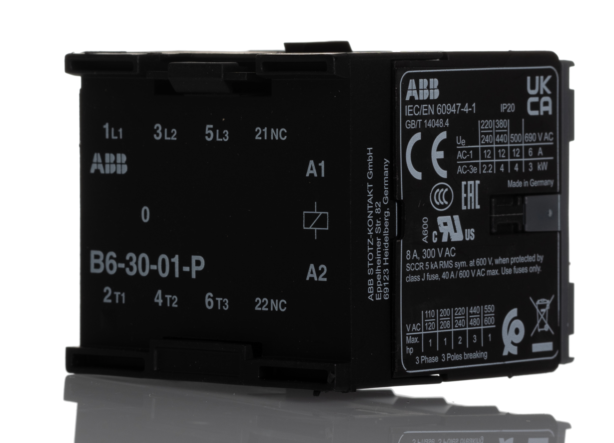 This is B6-30-01-P B Contactor 240 V Coil 3 Pole 20 A 4 kW 3NO manufactured by ABB. The manufacturer part number is GJL1211009R8010 B6-30-01-P 220-240V AC. It performs basic function of control unit. Whereas, the minimum operating temperature of the product is -25°c. The rated contact current is 20 a. The product b6, is a highly preferred choice for users. It has 220 → 240 v ac control voltage . The coil voltage of the product is 240 v. Its accurate length is 47.7mm. The product is available in din rail style. Furthermore, the product is 47.5mm wide. The product comes in 45.2mm depth. It is composed of [Number of Auxiliary Contacts] auxiliary contacts. The normal state configuration includes 3no. It features b6-30-01-p range. In addition, it has a standard 1nc auxiliary contact configuration . Feature 4 kw of power rating. It has a maximum operating temperature of +55°c. It has equipped with 3 poles.