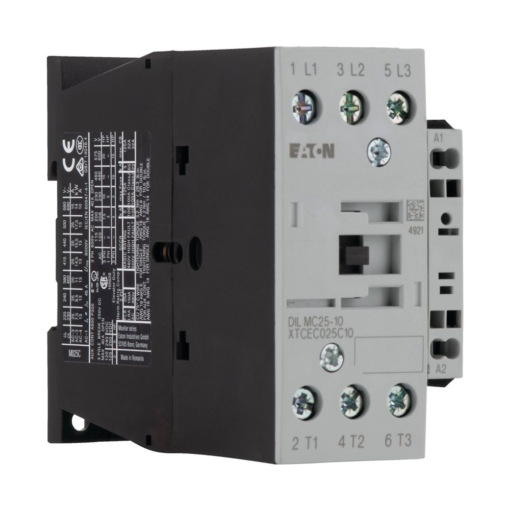 This is DILM Contactor 110 V Coil 3 Pole 14 kW 1N/O manufactured by Eaton. The manufacturer part number is 277638 DILMC25-10(110V50HZ,120V60HZ). It performs basic function of reversing. Whereas, the minimum operating temperature of the product is -25°c. The product dilm, is a highly preferred choice for users. The coil voltage of the product is 110 v. Its accurate length is 97mm. Furthermore, the product is 45mm wide. The product comes in 97mm depth. It is composed of [Number of Auxiliary Contacts] auxiliary contacts. The normal state configuration includes 1n/o. Feature 14 kw of power rating. It has a maximum operating temperature of +60°c. It has equipped with 3 poles. The terminal is a spring-loaded type.