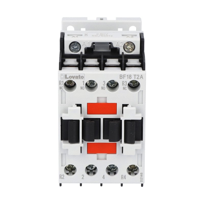 This is BF18 Series Contactor 230 V ac Coil 4-Pole 32 A 36 kW 2NO And 2NC 690 V manufactured by Lovato. The manufacturer part number is BF18T2A230. It performs basic function of straight. Whereas, the minimum operating temperature of the product is -50°c. In addition, it has a standard 2 no/2 nc auxiliary contact configuration . The product bf18, is a highly preferred choice for users. The coil voltage of the product is 230 v ac. Its accurate length is 81mm. Furthermore, the product is 45 mm wide. The product comes in 80.7mm depth. The normal state configuration includes 2 no/2 nc. Moreover, it has about 690v contact voltage . Feature 36kw of power rating. contactor is a versatile product designed to provide user-defined applications. It has equipped with 4 poles. It has a maximum operating temperature of 70°c. It has a din rail type mount .