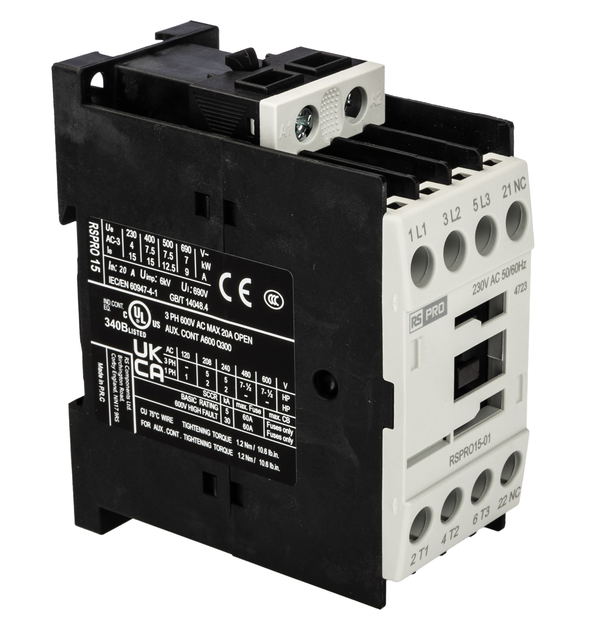 This is RSPRO15-01 Contactor 230 V AC Coil 3-Pole 15 A 7.5 kW 1NC 690 V manufactured by RS PRO. The manufacturer part number is 250-8804. It performs basic function of electromechanical. Whereas, the minimum operating temperature of the product is -25°c. It has a typical 15a load current. The rated contact current is 15 a. It has a maximum operating temperature of 60°c. It has 230v 50/60hz control voltage . The coil voltage of the product is 230 v ac. Its accurate length is 89mm. The product is available in din rail style. Furthermore, the product is 36mm wide. The product comes in 74mm depth. It is composed of [Number of Auxiliary Contacts] auxiliary contacts. The normal state configuration includes 1nc. It features rspro15-01 range. In addition, it has a standard 1nc auxiliary contact configuration . Feature 7.5 kw of power rating. The integrated contact has 690 v of voltage rating. It has equipped with 3 poles. The terminal is a screw type.