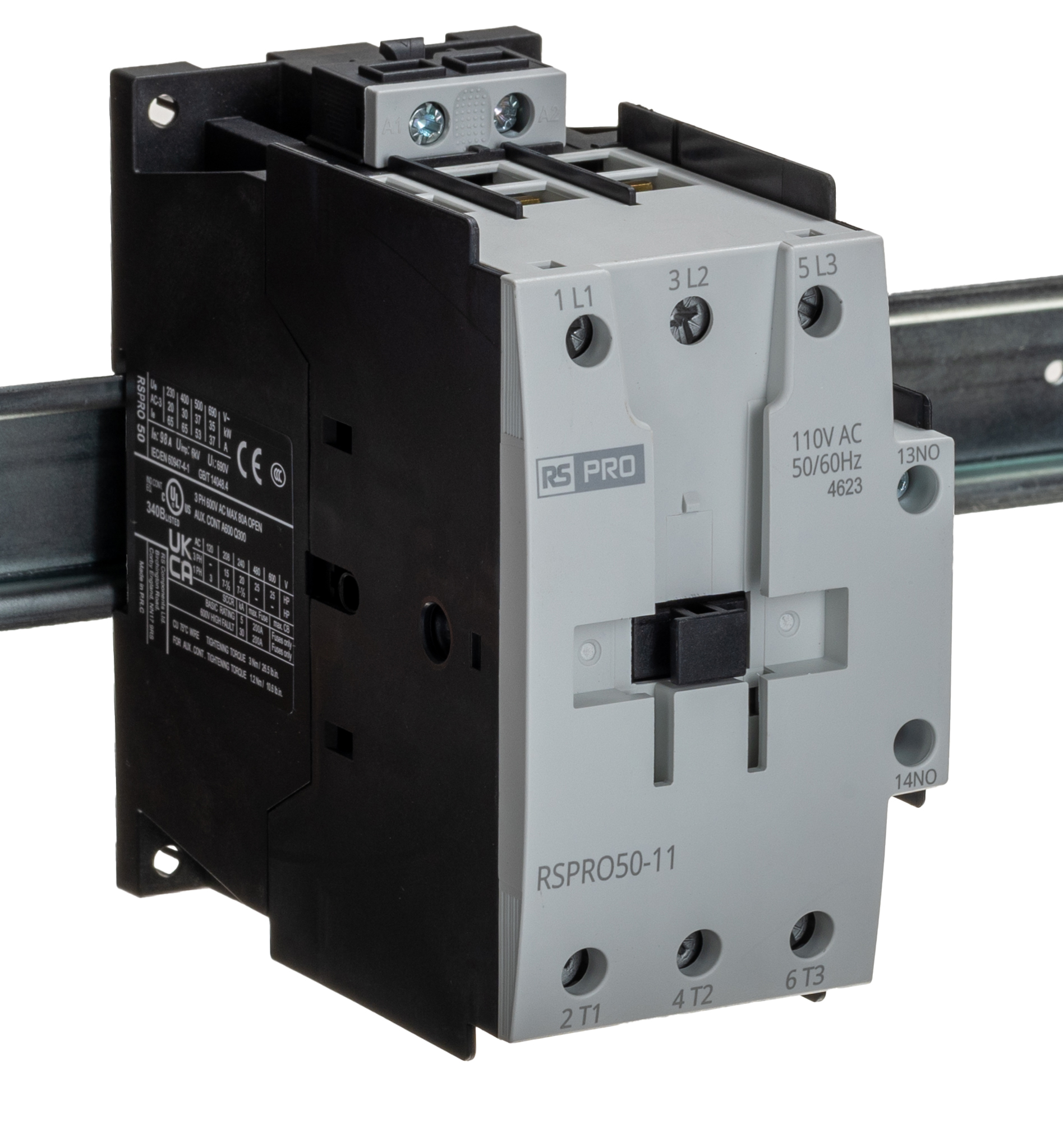 This is RSPRO50-11 Contactor 110 V AC Coil 3-Pole 50 A 22 kW 1NO/1NC 690 V manufactured by RS PRO. The manufacturer part number is 250-8835. The coil voltage of the product is 110 v ac. It has 3 pole and throw configuration. Furthermore, the product is 64 mm wide. It performs basic function of electromechanical. contactor is a versatile product designed to provide user-defined applications. It has a maximum operating temperature of 60°c. The terminal is a screw type. The normal state configuration includes 1 no/1 nc. Its accurate length is 120mm. Moreover, it has about 690v contact voltage . It has a din rail type mount . The product comes in 114mm depth. Whereas, the minimum operating temperature of the product is -25°c. In addition, it has a standard 1 no/1 nc auxiliary contact configuration . Feature 22kw of power rating. It has equipped with 3 poles.