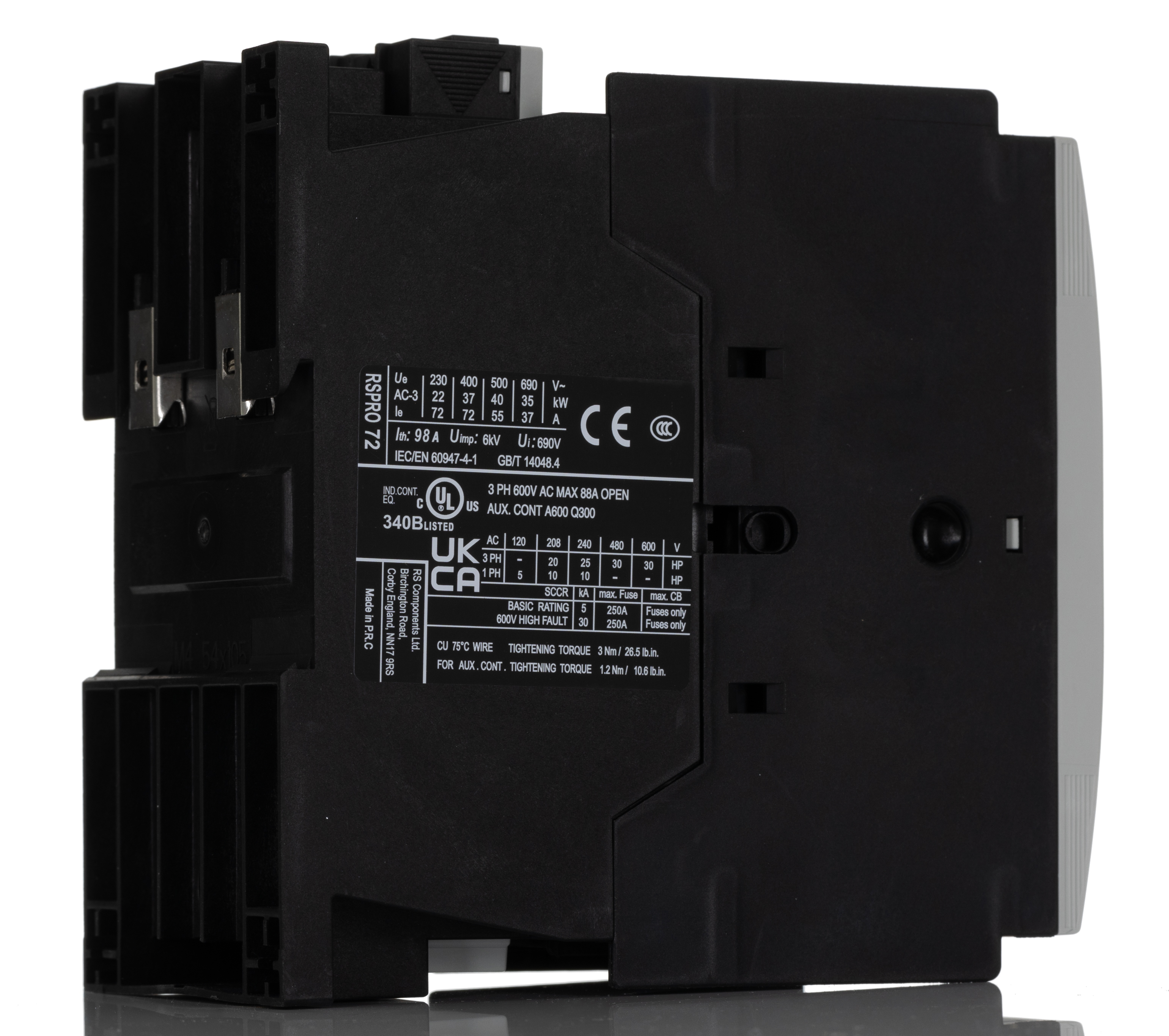 This is RSPRO72-11 Contactor 400 V AC Coil 3-Pole 72 A 37 kW 1NO/1NC 690 V manufactured by RS PRO. The manufacturer part number is 250-8844. The coil voltage of the product is 400 v ac. It has 3 pole and throw configuration. Furthermore, the product is 64 mm wide. It performs basic function of electromechanical. contactor is a versatile product designed to provide user-defined applications. It has a maximum operating temperature of 60°c. The terminal is a screw type. The normal state configuration includes 1 no/1 nc. Its accurate length is 120mm. Moreover, it has about 690v contact voltage . It has a din rail type mount . The product comes in 114mm depth. Whereas, the minimum operating temperature of the product is -25°c. In addition, it has a standard 1 no/1 nc auxiliary contact configuration . Feature 37kw of power rating. It has equipped with 3 poles.