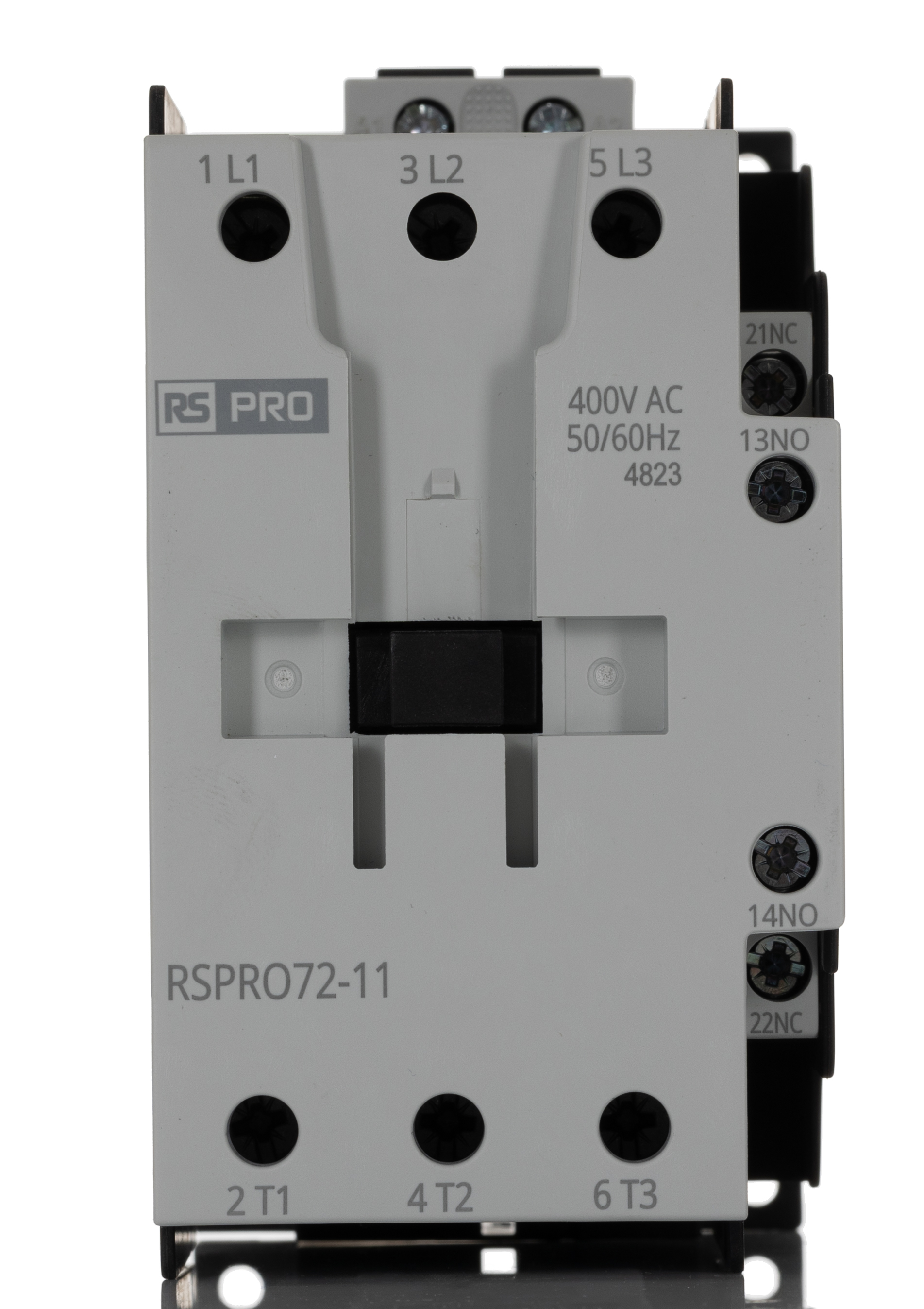 This is RSPRO72-11 Contactor 400 V AC Coil 3-Pole 72 A 37 kW 1NO/1NC 690 V manufactured by RS PRO. The manufacturer part number is 250-8844. It performs basic function of electromechanical. Whereas, the minimum operating temperature of the product is -25°c. It has a typical 72a load current. The rated contact current is 72 a. It has a maximum operating temperature of 60°c. It has 400v 50/60hz control voltage . The coil voltage of the product is 400 v ac. Its accurate length is 120mm. The product is available in din rail style. Furthermore, the product is 64mm wide. The product comes in 114mm depth. It is composed of [Number of Auxiliary Contacts] auxiliary contacts. The normal state configuration includes 1no/1nc. It features rspro72-11 range. In addition, it has a standard 1no/1nc auxiliary contact configuration . Feature 37 kw of power rating. The integrated contact has 690 v of voltage rating. It has equipped with 3 poles. The terminal is a screw type.