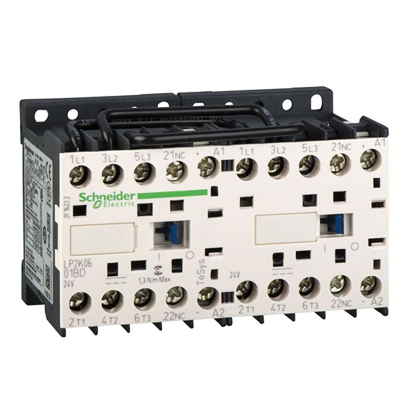 This is TeSys K LP2K Contactor 24 V dc Coil 3-Pole 6 A 3 kW 3NO 690 V ac manufactured by Schneider Electric. The manufacturer part number is LP2K0601BDTQ. The normal state configuration includes 3no. The rated contact current is 6 a. The product tesys k, is a highly preferred choice for users. The coil voltage of the product is 24 v dc. It features tesys k range. Feature 3 kw of power rating. The integrated contact has 690 v ac of voltage rating. It has equipped with 3 poles.