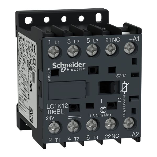 This is TeSys LC1K Contactor 24 V Coil 3-Pole 12 A 3 kW 3NO 24 V manufactured by Schneider Electric. The manufacturer part number is LC1K12106BLS207. The normal state configuration includes 3no. The rated contact current is 12 a. The product tesys k, is a highly preferred choice for users. The coil voltage of the product is 24 v. It features tesys range. Feature 3 kw of power rating. The integrated contact has 24 v of voltage rating. It has equipped with 3 poles.