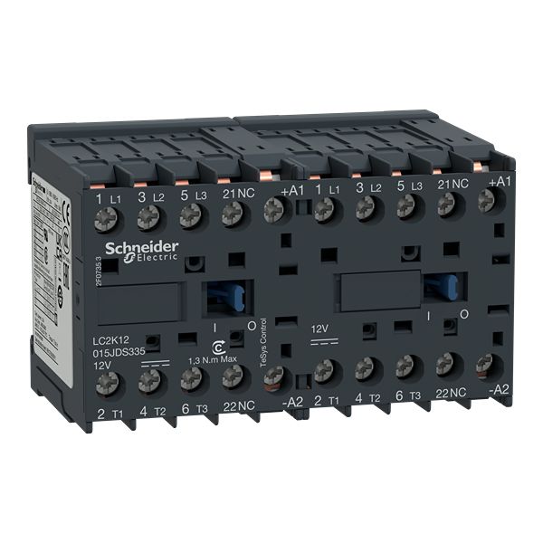 This is TeSys LC2K Contactor 12 V Coil 3-Pole 12 A 3 W 1NC 12 V manufactured by Schneider Electric. The manufacturer part number is LC2K12015JDS335. The rated contact current is 12 a. The product tesys k, is a highly preferred choice for users. The coil voltage of the product is 12 v. It features tesys range. The normal state configuration includes 1nc. Feature 3 w of power rating. The integrated contact has 12 v of voltage rating. It has equipped with 3 poles.