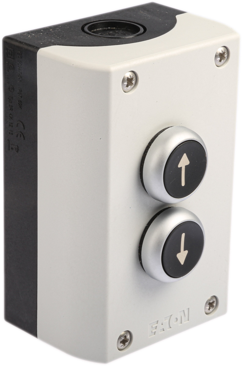 This is Momentary Enclosed Push Button - SPDT Plastic 2 Cutouts Black Arrow IP65 manufactured by Eaton. The manufacturer part number is 78640752 M22-I2-(511-4996). It has 230v maximum DC voltage. A bespoke product carries 500v of maximum AC voltage. Whereas, the minimum operating temperature of the product is -25°c. It also carries 4a maximum current. It is IP rated with ip65. The product rmq titan m22, is a highly preferred choice for users. Its accurate length is 120mm. It has arrow marking on push button . In addition, its enclosure is made up of plastic material . The push button has momentary actuation mechanism. The product comes in 56mm depth. Additionally, it includes 2 cutouts . While it has an adorable black colour. Its is offered with grey colour enclosure . Whereas its cut-out diameter is 22mm. Pushbutton is manufactured from highly rugged and reliable plastic material. It has a maximum operating temperature of +70°c. The terminal is a screw type. The contact is equipped with spdt configuration.