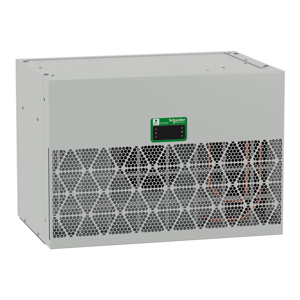 This is ClimaSys Series Enclosure Cooling Unit 1550W 400/460V ac 850m³/h 395 x 595 x 412mm manufactured by Schneider Electric. The manufacturer part number is NSYCU1K52P4RDG. It features a noise level of 70db. It exhibits 1550w input power . Furthermore, the product is 595 mm wide. Its power consumption is approximately 760w . It has a 850m³/h air flow rate. The product requires a maximum 460v ac supply voltage . It has a/an roof connected type cooler . The product is made from highly stable and reliable steel. enclosure cooling unit is a versatile product designed to provide user-defined applications. With a 55°c maximum temperature setting . It has a maximum 1550w cooling power . It is IP rated with ip24, ip54. The product comes in 395mm depth. It has a roof type mount . With an r134a type refrigerant . The typical product's weight is 39kg. The product climasys, is a highly preferred choice for users. In addition, the height is 412mm. Supplied with 60hz of frequency. In addition, it has about 3a nominal current . It is created with 1550w of cooling capacity .