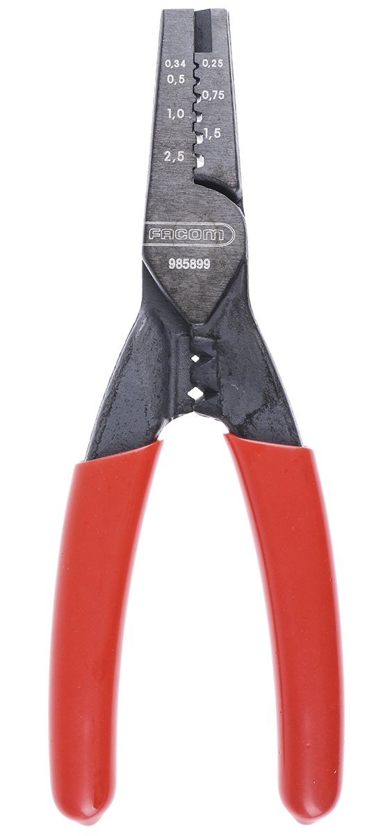 This is Cable Crimper 140mm 2.5 mm² manufactured by Facom. The manufacturer part number is 985899. The product 985, is a highly preferred choice for users. Ratcheting Options - no. It has an overall length of 140 mm. The product is highly suitable for wire ferrules. It allows to operate using hand. crimp tool is a versatile product designed to provide user-defined applications. It has 0.5 → 2.5mm² size wire in mm² .