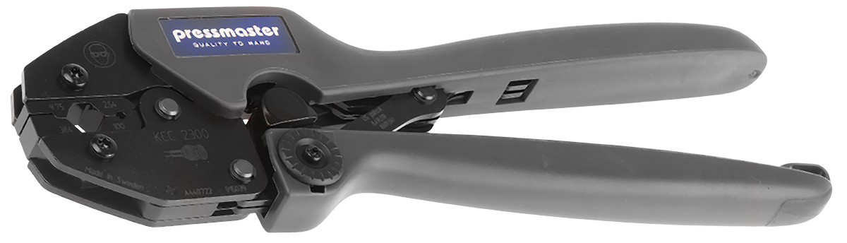 This is Ratchet Crimping Tool manufactured by Pressmaster. The manufacturer part number is 4300-2437. It allows to operate using hand. crimp tool is a versatile product designed to provide user-defined applications. Ratcheting Options - yes.