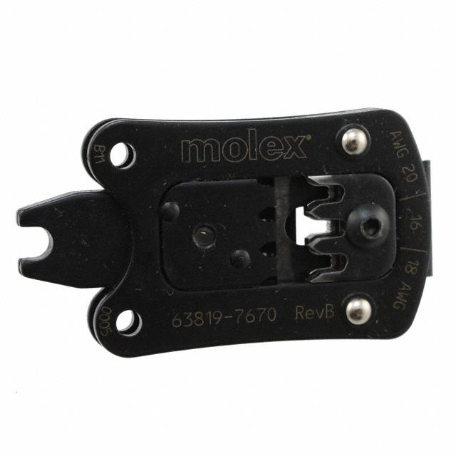 This is manufactured by Molex. The manufacturer part number is 0638197670. The product is suitable for use with rectangular contacts, 16-20 awg. This is basically a useful and handy crimp head. It is assigned with possible HTSUS value of 8207.90.7585. It is shipped in bulk package . The product premiumgrade, is a highly preferred choice for users. The product is rohs3 compliant. In addition, it is reach unaffected. Its typical moisture sensitivity level is 1 (unlimited). Moreover, it corresponds to 063819, a base product number of the product. The compatible tools include 63816-0100, 63816-0200, 63819-7600. The product is designated with the ear99 code number.