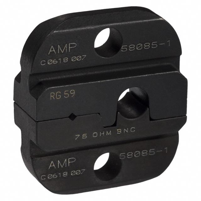 This is manufactured by TE Application Tooling. The manufacturer part number is 58085-1. The product is suitable for use with coaxial, rf - bnc. This is basically a useful and handy die set. It is assigned with possible HTSUS value of 8203.20.8000. It is shipped in bulk package . Specifications include diamond - 0.044"; round - 0.240". The product pro-crimper iii, is a highly preferred choice for users. The product is not applicable. Its typical moisture sensitivity level is not applicable. Moreover, it corresponds to 58085, a base product number of the product. The compatible tools include 354940-1. Cable Group Options: rg-59. The product is designated with the ear99 code number.