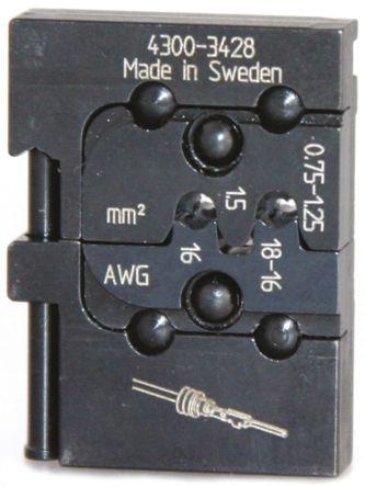 This is Crimp Die Set 1.5 with Wire Seal Wire size 0.5 → 1.5 mm² 0.75 → 1.25 mm² 1.5 mm² manufactured by Pressmaster. The manufacturer part number is 4300-3428/AAB. On the other hand, the wire has 0.5mm² of minimum size. Its crimp connector type is 1.5 with wire seal . The wire has a maximum size of 1.5mm².
