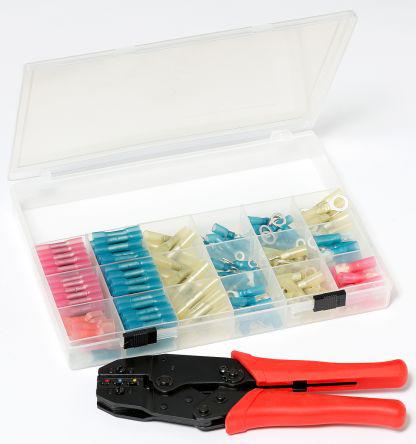 This is 225 piece Heat-Shrink Terminal Kit Heat Shrink Terminals and Splices manufactured by HellermannTyton. The manufacturer part number is A8190227T. The product is made from sturdy copper materials. This versatile kit contents include crimp tool, 225 assorted heat shrink terminals components. heat shrink terminals and splices Connector type offer robust functionality.