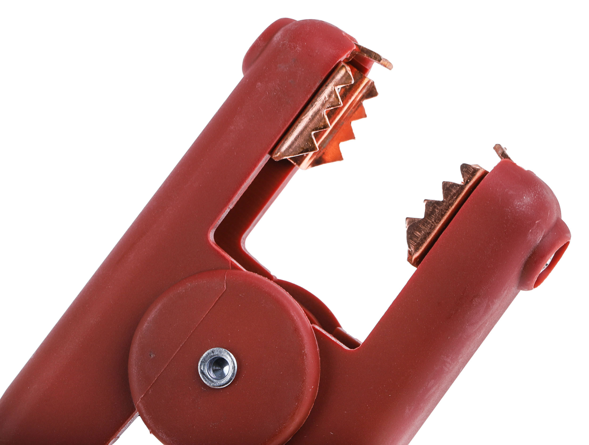 This is Mueller Crocodile Clip Copper Contact 300A Red manufactured by Mueller Electric. The manufacturer part number is BU-102BK-2. Equipped with a 41mm jaw opening. It has a decent red colour. The product has a current rating of 300a. The product is insulated yes . The product is made from sturdy copper materials.