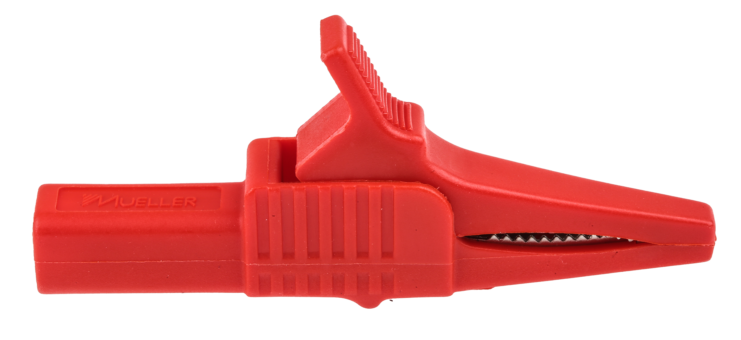 This is Mueller Crocodile Clip Steel Contact 30A Red manufactured by Mueller Electric. The manufacturer part number is BU-65-2. Equipped with a 19mm jaw opening. The product is insulated yes . It has a decent red colour. Features a 30a current in A. It has a robust fibreglass reinforced nylon insulation material. crocodile clip is a versatile product designed to provide user-defined applications. The product is made from sturdy nickel plated steel materials.