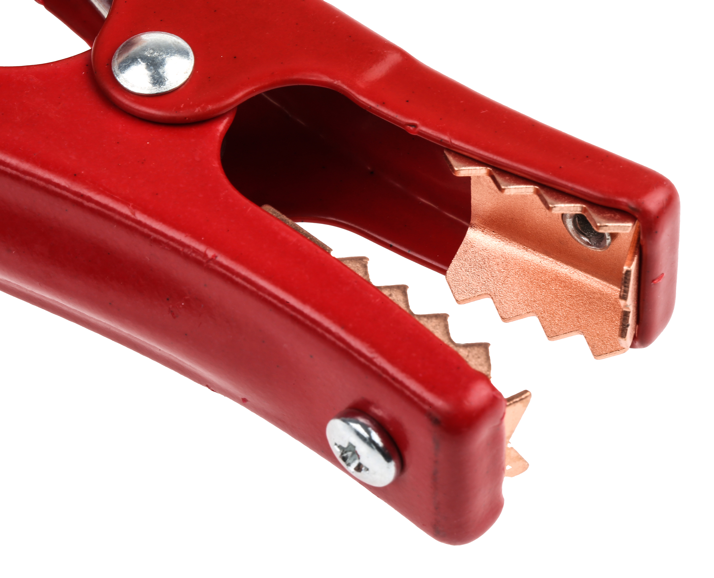 This is Mueller Grabber Clip Copper Contact 200A Red manufactured by Mueller Electric. The manufacturer part number is BU-X15400-2. Equipped with a 38mm jaw opening. The product is insulated yes . The product has a current rating of 200a. It has a decent red colour. It has a robust pe insulation material. The product is made from sturdy copper materials.
