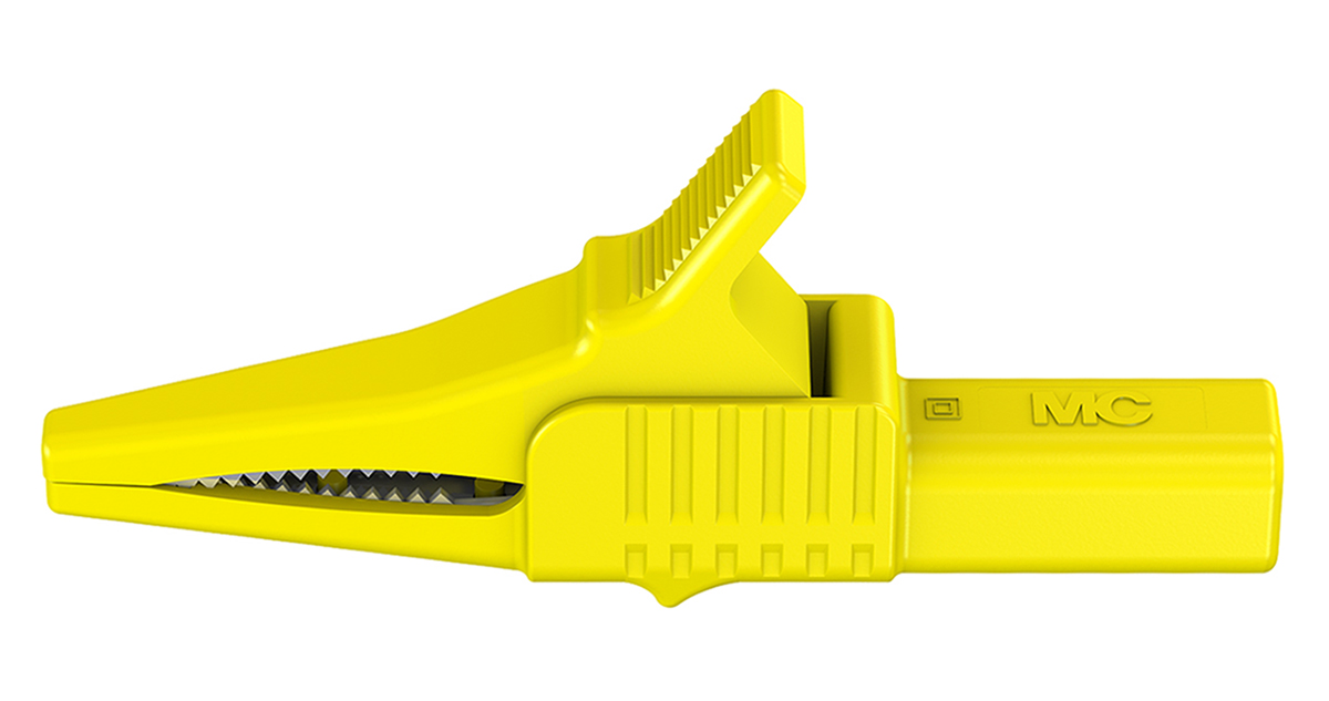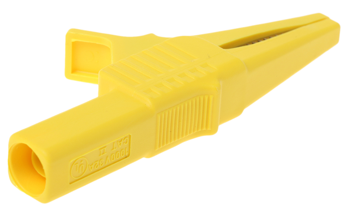 Wide jaw crocodile safety clips Fully insulated in 6.6 polyamide. Wide jaw opening. Steel spring tightening. 4 mm safety socket to connect all normal 4 mm plugs. Nickel-plated brass. Good contact.