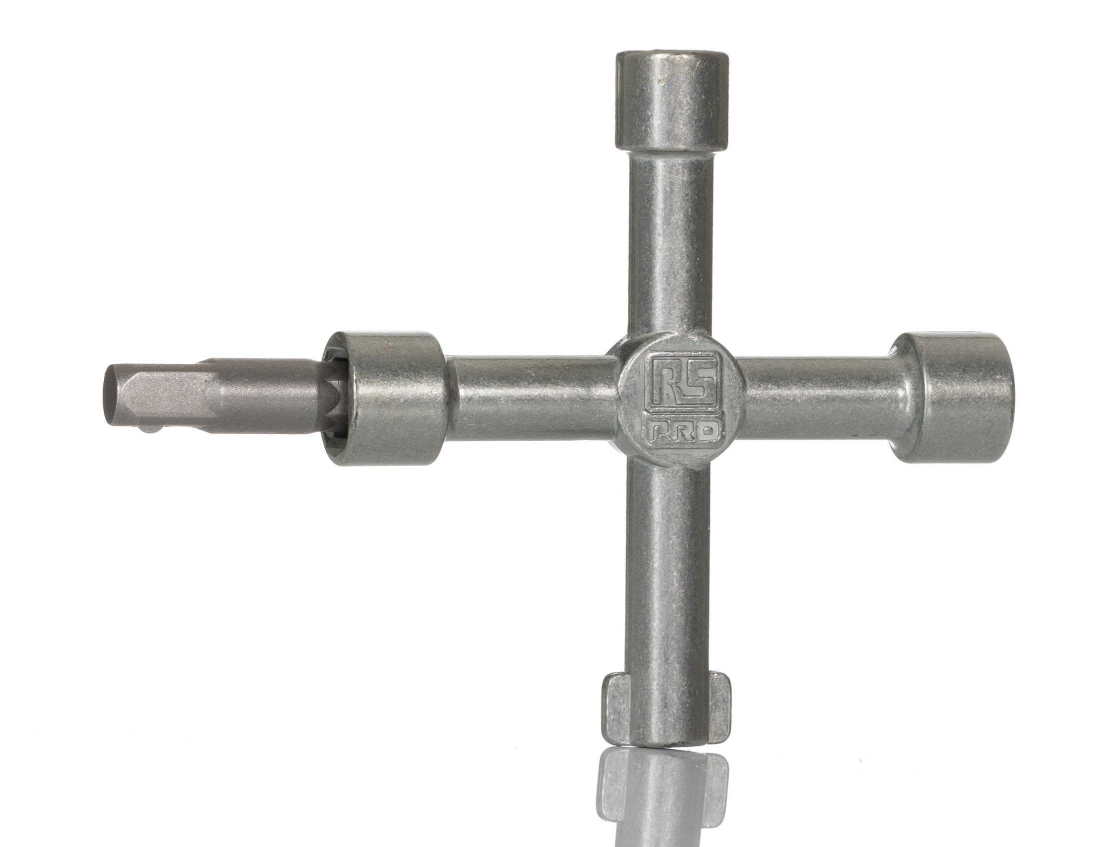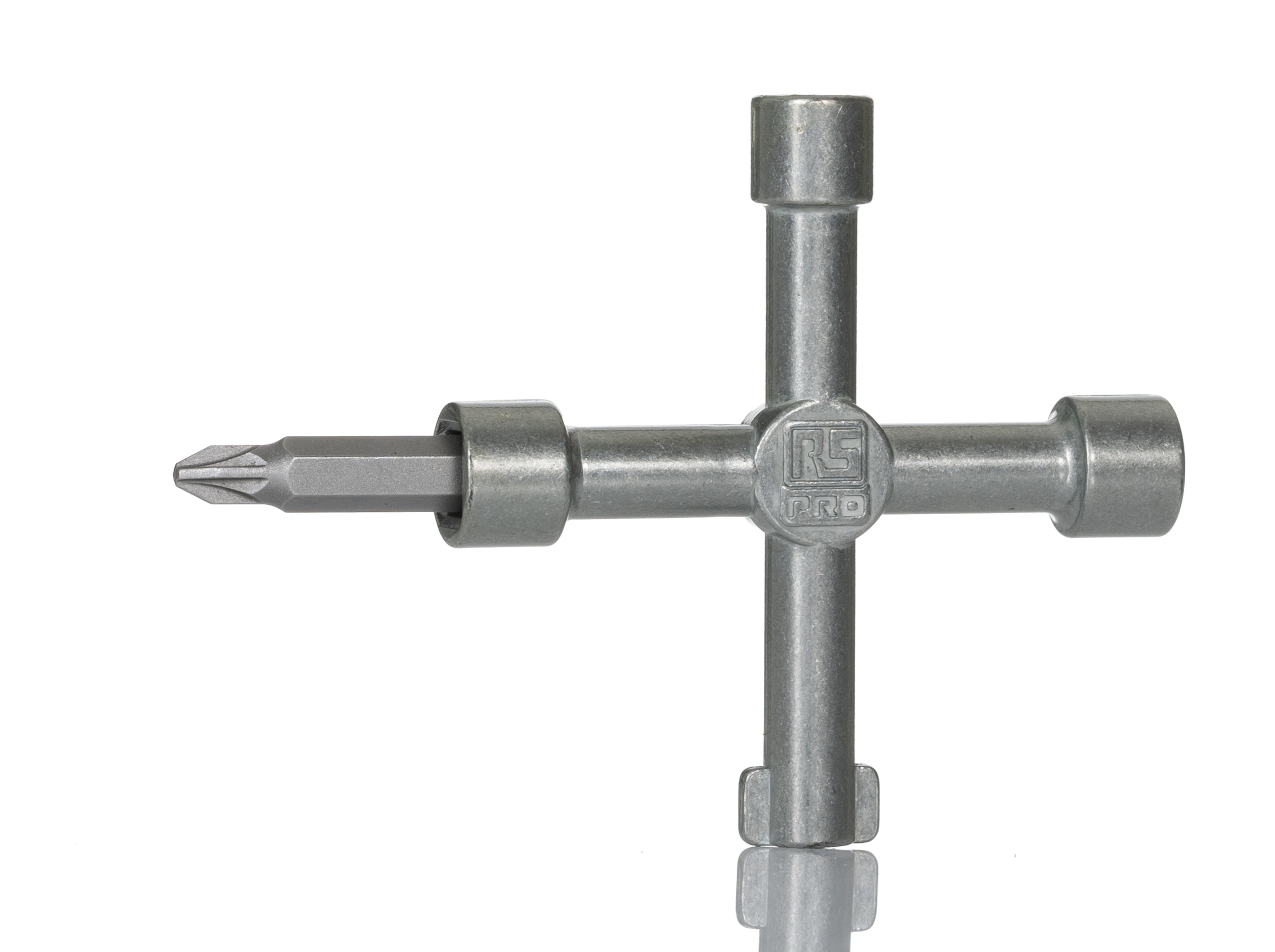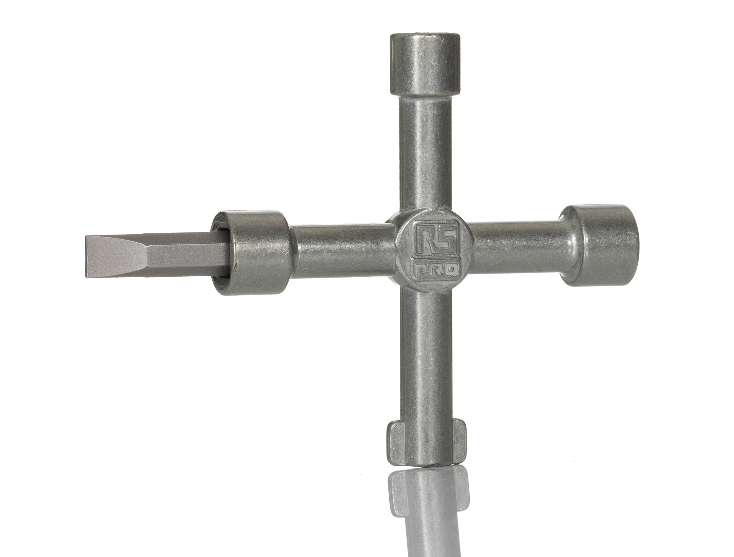 RS Pro Multi-Purpose Cabinet Key RS Pro multi-purpose cabinet key. Four position arm tool, offering five differing drive possibilities. This universal cross key is made of alloy with excellent workmanship and durability. Key holes with square, triangle and circle shapes suitable for many especially radiators and electric control cabinet. Compact size, easy to carry and store, an essential tool for maintenance applications. Features and Benefits 6.5 mm and 8.1 mm square sockets 6.4 mm ( in) AF Hex socket 9.8 mm triangular socket 9 mm winged key drive Hex to in square drive adapter 7 mm slotted blade Pozidriv drive screwdriver bit Finish Options Chrome - RS Stock no: 439-3019 Matt - RS Stock no: 439-3025 Application information RS Pro multi-purpose cabinet key wrenches are designed for use within maintenance and service applications. Supplied with A hex to 1/4 in square drive adaptor, a 7mm slotted blade & No.2 pozi drive screwdriver bit.