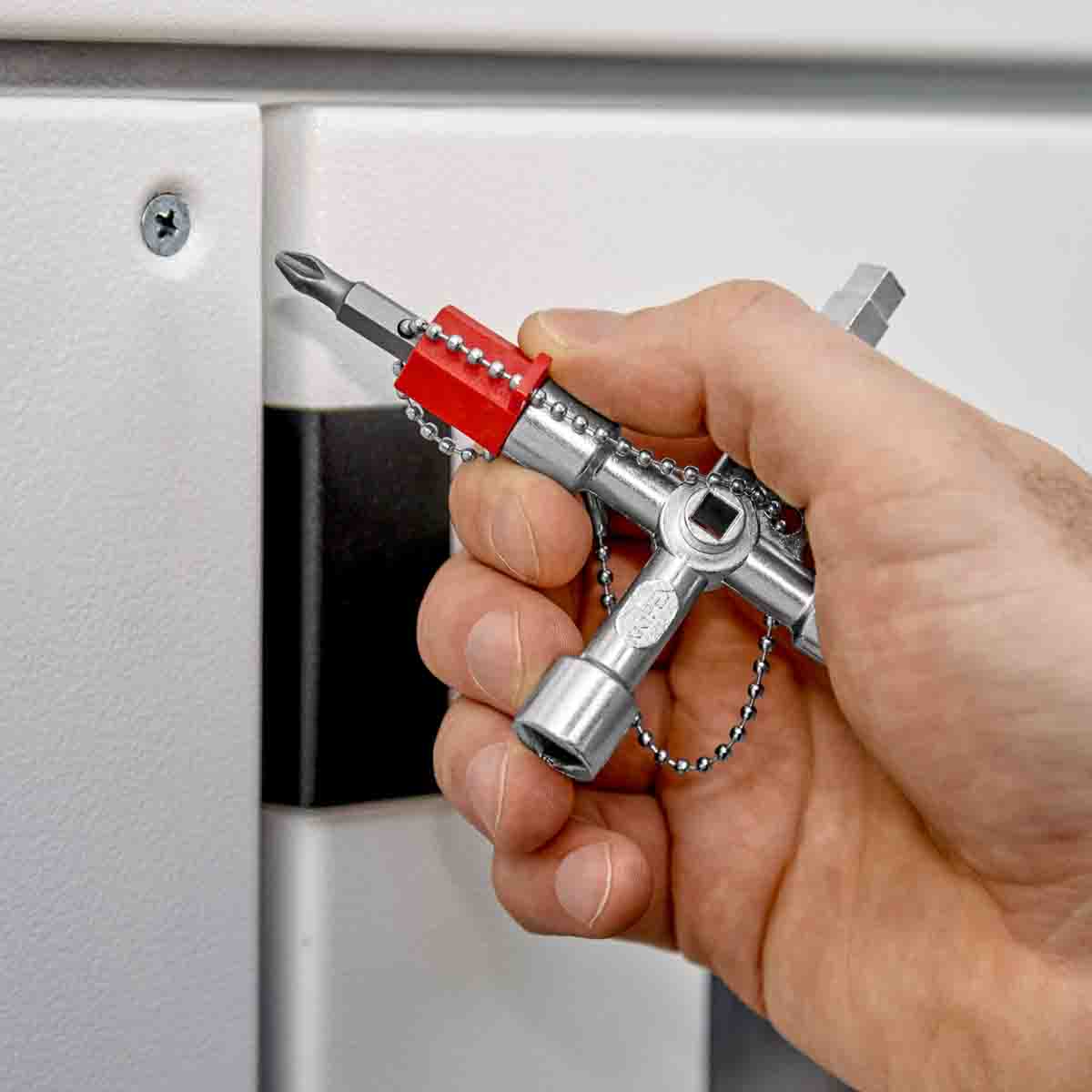This is Cabinet Key Diecast Zinc manufactured by Knipex. The manufacturer part number is 00 11 04. Moreover, it has 10 key profiles . The product's body is nicely designed from diecast zinc materials. A quality product with a nice chrome finish. The key is a control cabinet key key with exquisite design.