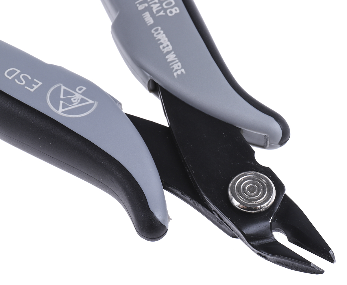 This is Chamfered Type Wire Cutter 138mm overall length 1.63mm cutting capacity manufactured by RS Pro. The manufacturer part number is 245-0508. VDE/1000V Approval Options - no. It has a non sparking nature no . Moreover, it has a side cutters type cutter . The product is made from highly stable and reliable steel. It has an overall length of 138 mm. It has a/an chamfered type cut . ESD Safety - yes. It is offered to cut copper wire materials . It is height safe no . Moreover, it has a maximum 1.6mm cutting capacity .