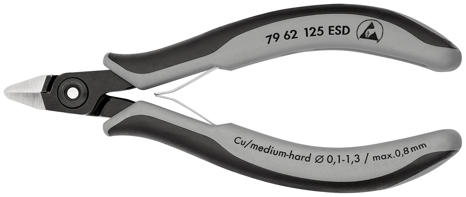 This is Diagonal Type Wire Cutter 125mm overall length 1.3mm cutting capacity manufactured by Knipex. The manufacturer part number is 79 62 125 ESD. VDE/1000V Approval Options - no. It has a non sparking nature no . In addition, it has about 0mm hard wire cutting capacity . Moreover, it has a precision diagonal cutter type cutter . The product is tailored with 1.3mm copper wire cutting capacity . The product is made from highly stable and reliable chrome-plated steel with ball bearings. It has an overall length of 125 mm. It has a model number knipex. It has a/an without bevel type cut . Furthermore, it has about 0.8mm soft steel wire cutting capacity . ESD Safety - yes. It is offered to cut copper wire, soft wire materials . The product has about 0mm stranded wire cutting capacity . It has 1.3mm cutting capacity soft wire . It is height safe no . Moreover, it has a maximum 1.3mm cutting capacity . It has about 0.8mm cutting capacity medium hard wire .