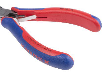 This is Cutters 115 mm Tool Steel manufactured by Knipex. The manufacturer part number is 64 12 115 SB. It jaw is about 6mm in length . Moreover, it has a maximum 2mm cutting capacity . In addition, it has about 0.5mm hard wire cutting capacity . The product is made from highly stable and reliable tool steel. It has 2mm cutting capacity soft wire . It has an overall length of 115 mm. It has about 0.8mm cutting capacity medium hard wire . It comes in end cutter configuration.