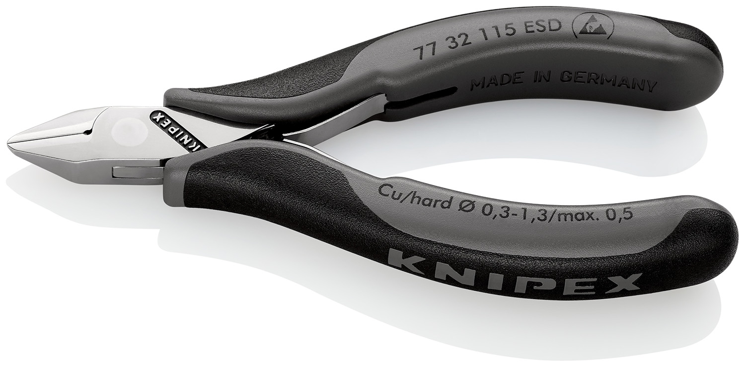 This is Diagonal Type Wire Cutter 115mm overall length 1.3mm cutting capacity manufactured by Knipex. The manufacturer part number is 77 32 115 ESD. VDE/1000V Approval Options - no. It has a non sparking nature no . In addition, it has about 0.5mm hard wire cutting capacity . Moreover, it has a precision diagonal cutter type cutter . The product is tailored with 1.3mm copper wire cutting capacity . The product is made from highly stable and reliable chrome-plated steel with ball bearings. It has an overall length of 115 mm. It has a model number knipex. It has a/an with bevel type cut . Furthermore, it has about 1mm soft steel wire cutting capacity . ESD Safety - yes. It is offered to cut copper wire, soft wire materials . The product has about 0.5mm stranded wire cutting capacity . It has 1.3mm cutting capacity soft wire . It is height safe no . Moreover, it has a maximum 1.3mm cutting capacity . It has about 1mm cutting capacity medium hard wire .