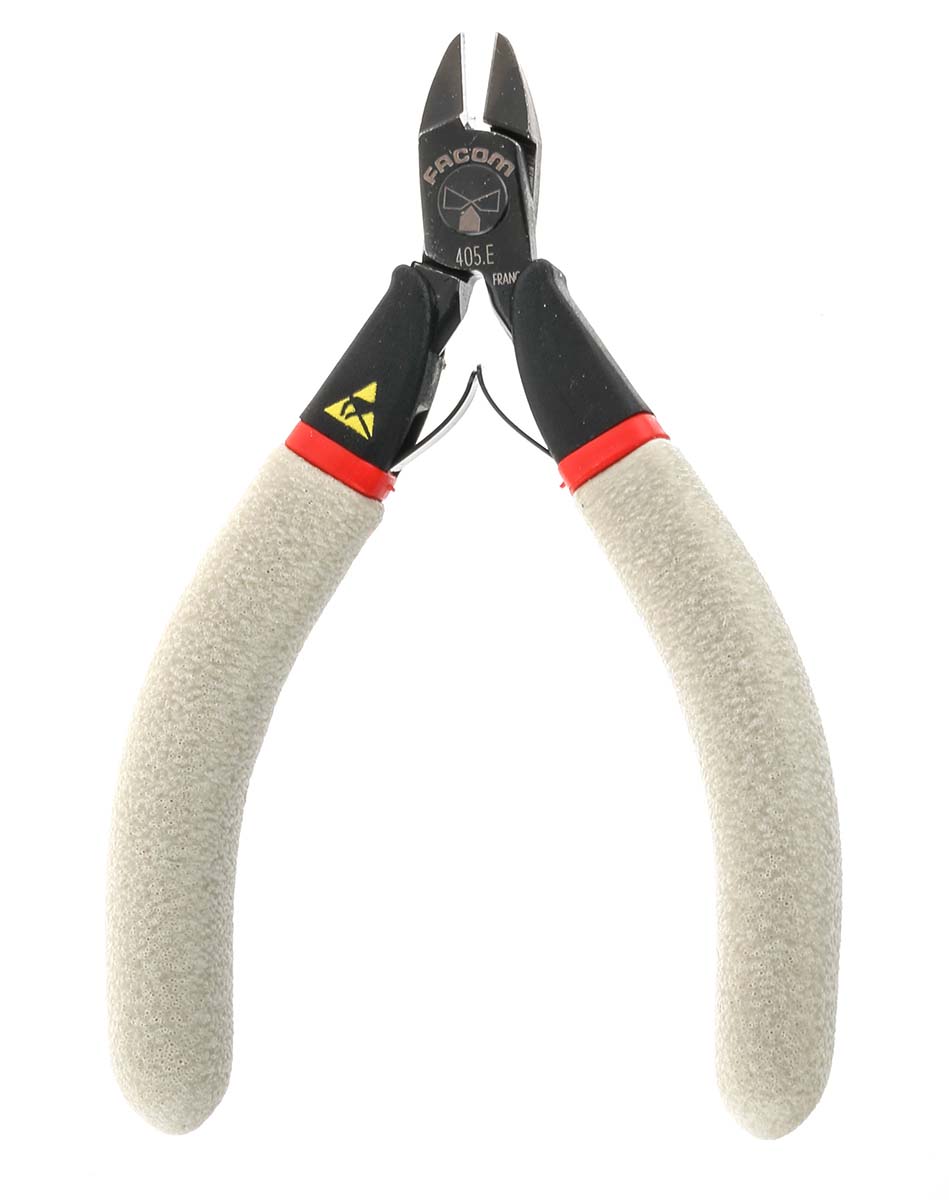 This is Axial Type Wire Cutter 110mm overall length 1.3mm cutting capacity manufactured by Facom. The manufacturer part number is 405.E. Moreover, it has a maximum 1.3mm cutting capacity . Moreover, it has a side cutters type cutter . ESD Safety - yes. It has a/an flush type cut . It is offered to cut copper wire, ferrous wire, piano wire materials . It has an overall length of 110 mm.