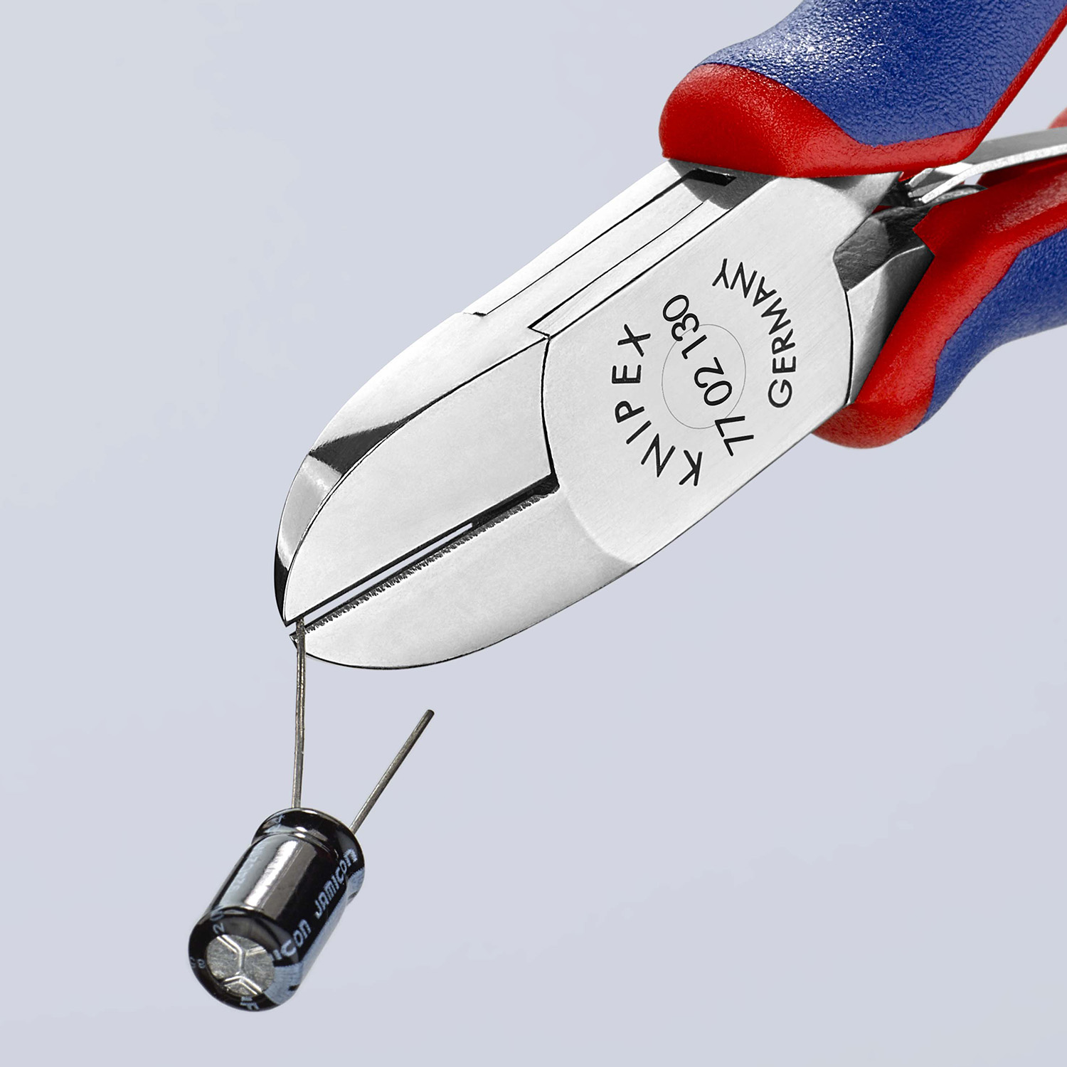 This is Diagonal Type Wire Cutter 130mm overall length 2mm cutting capacity manufactured by Knipex. The manufacturer part number is 77 02 130. VDE/1000V Approval Options - no. It has a non sparking nature no . In addition, it has about 0.8mm hard wire cutting capacity . Moreover, it has a precision diagonal cutter type cutter . The product is tailored with 2mm copper wire cutting capacity . The product is made from highly stable and reliable chrome-plated steel with ball bearings. It has an overall length of 130 mm. It has a model number knipex. It has a/an with bevel type cut . Furthermore, it has about 1.5mm soft steel wire cutting capacity . ESD Safety - no. It is offered to cut copper wire, soft wire materials . The product has about 0.8mm stranded wire cutting capacity . It has 2mm cutting capacity soft wire . It is height safe no . Moreover, it has a maximum 2mm cutting capacity . It has about 1.5mm cutting capacity medium hard wire .