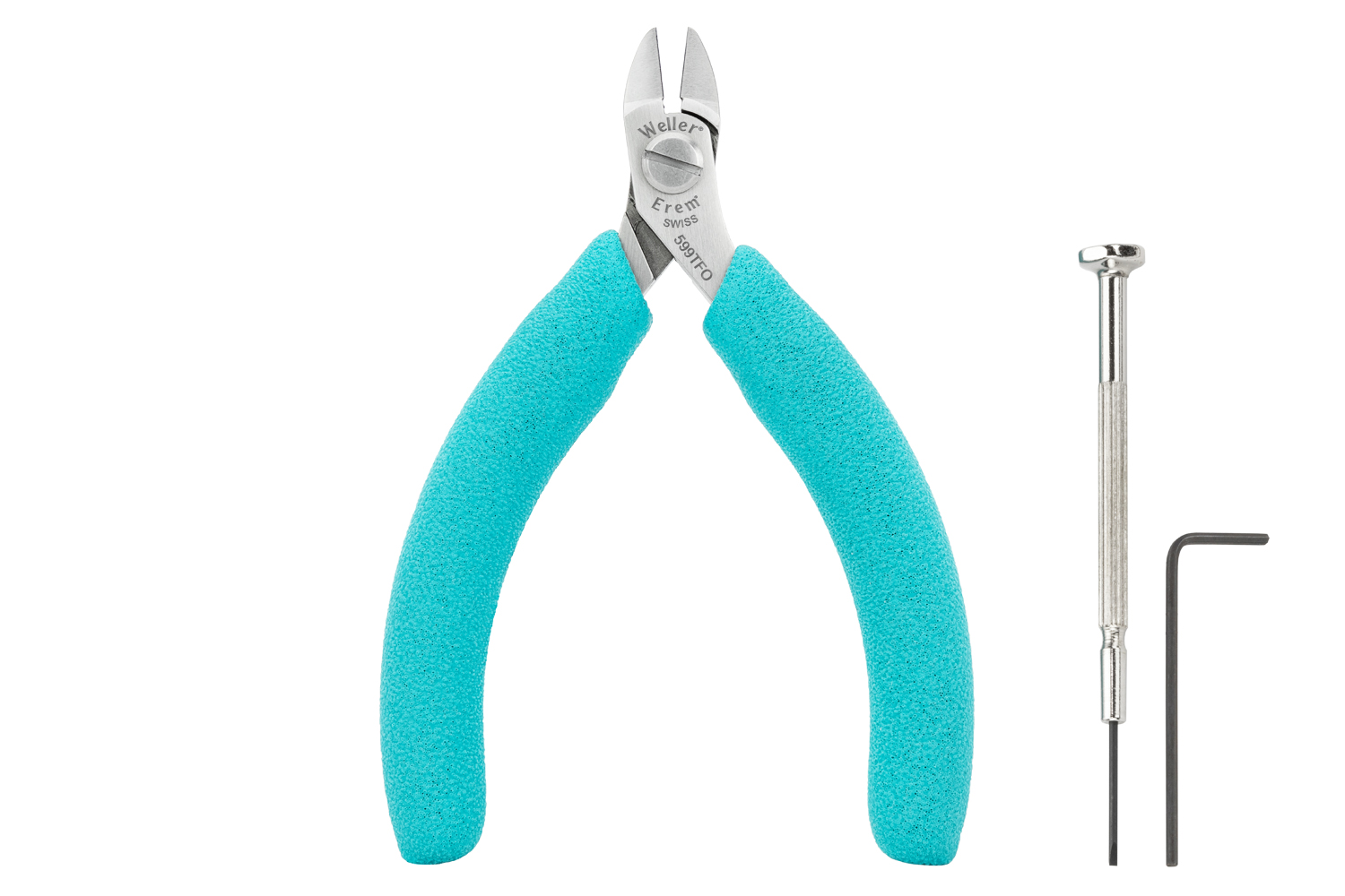 This is 115 mm Electronics Side Cutter manufactured by Erem. The manufacturer part number is 599TFO. It jaw is about 19mm in length . Moreover, it has a maximum 1.2mm cutting capacity . Moreover, it has a fibre optic cutters type cutter . It has an overall length of 115 mm. It has a model number 599 esd. It has a/an semi flush type cut . ESD Safety - yes.