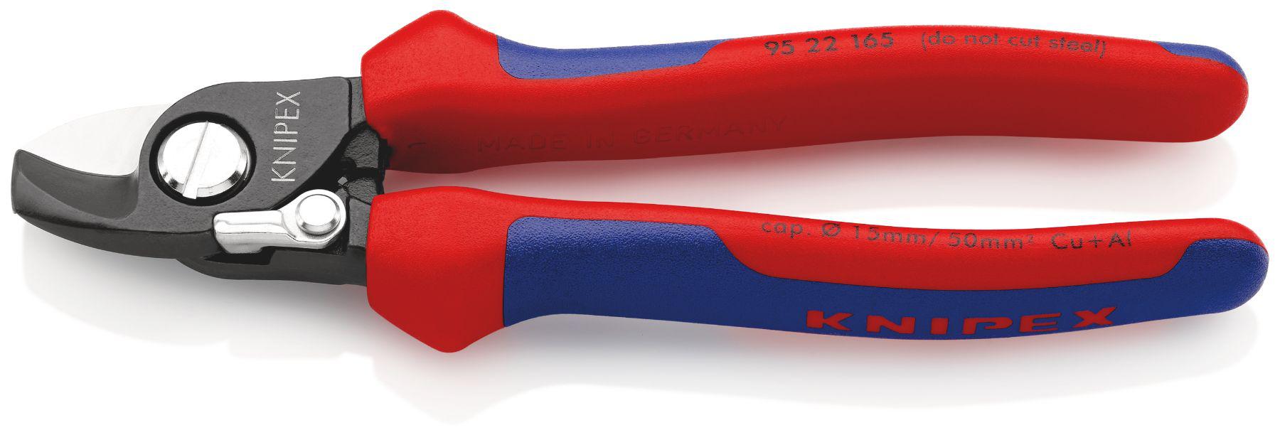 This is Cable Cutters manufactured by Knipex. The manufacturer part number is 95 22 165. It has a non sparking nature no . Moreover, it has a cable cutters type cutter . The product is made from highly stable and reliable special quality tool steel. It has an overall length of 165 mm. It has a model number 95 22 165. ESD Safety - no. It is offered to cut aluminium wire, copper wire materials . It is height safe no .