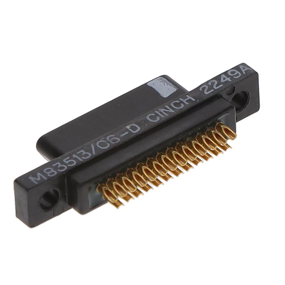 This is manufactured by Cinch Connectivity Solutions. The manufacturer part number is M83513/06-D. 0.050 pitch x 0.043 row to row is the shell size and connector layout. Furthermore, housing/shell (unthreaded) is the Flange Feature of the product. It is assigned with possible HTSUS value of 8536.69.4030. The product is rohs compliant. The product has -55°c ~ 125°c operating temperature range. It comes in d-type, micro-d connector style. Moreover, the product is constructed from highly polyester, glass filled dielectric material. The product carries possible position value of 25. In addition, it is vendor undefined. It comes in 2 of rows. The basic product material is plastic. It is shipped in bag package . plug, male pins Connector type offer robust functionality. Furthermore, the product is galvanized with excellent gold contact finishing. Its typical moisture sensitivity level is 1 (unlimited). The product features solder cup termination style. It has a long 26 weeks standard lead time. Additionally, the product's output is 3a. The product is available in panel mount configuration. The product military, mil-c-83513, m83513, is a highly preferred choice for users. It is made from durable shell materials and has an excellent finishing such as plastic. It has typical contact type of signal. The product is made from sturdy copper alloy materials. The product is designated with the ear99 code number.